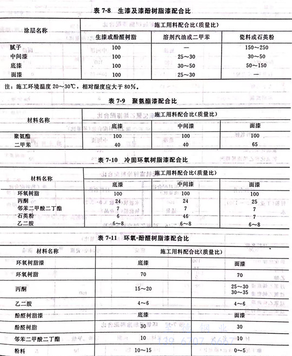生漆(qi)及(ji)漆(qi)酚樹(shu)(shu)脂(zhi)(zhi)、聚氨酯漆(qi)、冷固環氧(yang)樹(shu)(shu)脂(zhi)(zhi)漆(qi)、環氧(yang)-酚醛(quan)樹(shu)(shu)脂(zhi)(zhi)漆(qi)、環氧(yang)-呋喃(nan)樹(shu)(shu)脂(zhi)(zhi)漆(qi)、酚醛(quan)樹(shu)(shu)脂(zhi)(zhi)漆(qi)、氯(lv)(lv)磺化(hua)聚乙烯(xi)漆(qi)、無機富鋅涂(tu)(tu)料、過氯(lv)(lv)乙烯(xi)涂(tu)(tu)料、環氧(yang)銀粉涂(tu)(tu)料及(ji)KJ-130涂(tu)(tu)料的基本配方見表7-8~表7-18.