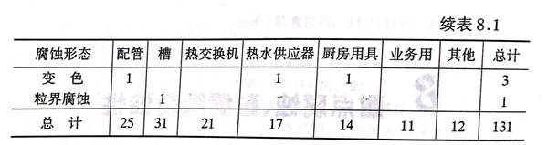 鈍化膜的存在使不銹(xiu)鋼維持其耐蝕性。在不銹鋼表面產生的局部集中腐蝕,最后形成孔狀的現象叫做點腐蝕(shi),Uhlig(1940年)認為點腐蝕是導致鈍態破壞的原因。此外,在金屬/金屬之間、金屬/非金屬之間或附著物下出現縫隙時,縫隙的一部分或全部被腐蝕的現象叫縫隙腐蝕。在有機酸環境下也會出現這些腐蝕現象,在實際應用中,很多問題出現在以海水為代表的含有少量氯離子的環境中。正如第7章中圖7.1所示,在化學工廠中的腐蝕事例中,點腐蝕和縫隙腐蝕事例是繼應力腐蝕斷裂之后出現最頻繁的問題,特別是近幾年來不銹鋼的用途在水處理領域中不斷擴大,因此成為一個非常重要的問題。金子等人在1990年對處于水環境中的不銹鋼腐蝕事例進行了分析,表8.1是從其分析結果中摘錄的按用途和形態所作出的總計結果。根據表8.1,點腐蝕和縫隙腐蝕占總數的49%,此外如果把大氣中的生銹也看作從小孔開始,然后逐漸擴散,那么也可以把它看作為點腐蝕、縫隙腐蝕等局部腐蝕的一種,所以再加上大氣中的腐蝕,那54%的腐蝕都屬于這種腐蝕形態,它與應力腐蝕斷裂一起成為不銹鋼所面臨的重大問題。