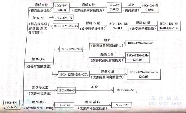 式中各元(yuan)素(su)符號分別表示該元(yuan)素(su)在(zai)(zai)鋼中的質量(liang)百(bai)分數(shu)含量(liang)。在(zai)(zai)18-8鋼基礎上,奧(ao)氏體不銹(xiu)鋼的發展變化過程見圖3-4。