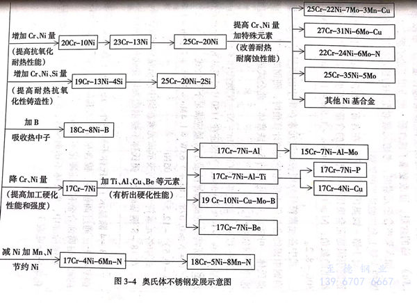 圖3-4除顯示了奧(ao)氏體不銹鋼外,還(huan)顯示了在奧(ao)氏體不銹鋼基礎上(shang),通過調整鉻、鎳含量或(huo)加入(ru)其(qi)他合金元素后演變而來(lai)的部分耐腐蝕合金和沉淀硬化(hua)不銹鋼。