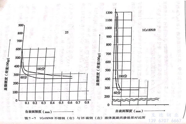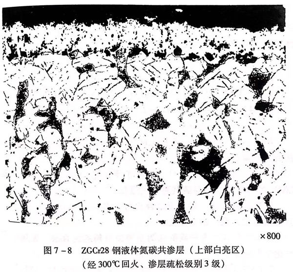 由于合金元素(su)的(de)影響,與碳(tan)鋼相(xiang)比,在相(xiang)同條件下(xia)不銹(xiu)鋼氮(dan)碳(tan)共(gong)滲(shen)層(ceng)硬度(du)更高,但滲(shen)層(ceng)深度(du)淺,硬度(du)變化梯度(du)大,見(jian)圖7-7。圖7-8是ZGCr28的(de)氮(dan)碳(tan)共(gong)滲(shen)組(zu)織圖。
