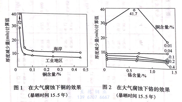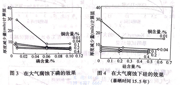 在(zai)這里重要的是:這些(xie)合(he)(he)金元(yuan)素復合(he)(he)添(tian)加,可以獲得比(bi)分別單獨添(tian)加更高的雙(shuang)重效果,Cr、P等與Cu共存最初(chu)發揮作用的結果表(biao)示在(zai)圖(tu)(tu)2~圖(tu)(tu)4。復合(he)(he)添(tian)加的代表(biao)是U.S.Steel公司開發的添(tian)加了Cu-P-Cr-Ni的COR-TEN鋼,把這種鋼的耐候性與碳素鋼及含銅鋼的進行比(bi)較,結果表(biao)示于圖(tu)(tu)5。