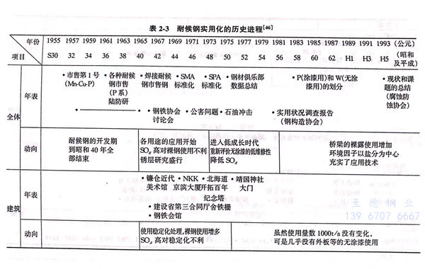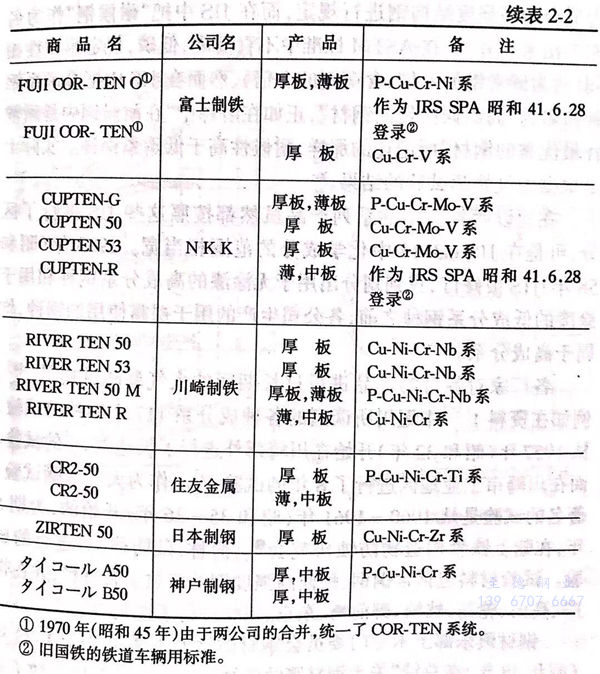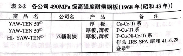 詳(xiang)情請參照卷末的(de)(de)(de)資(zi)料(liao)1,最初(chu)銷售(shou)的(de)(de)(de)鋼(gang)種在1957年(昭(zhao)和(he)(he)32年)是(shi)(shi)銅系(xi)的(de)(de)(de)Cuplon鋼(gang),1960年(昭(zhao)和(he)(he)35年)是(shi)(shi)YAW-TEN鋼(gang)(Cu-P-Ti系(xi))、FUJI COR-TEN鋼(gang),1961年開始生產(chan)銷售(shou)Cupten鋼(gang)(Cu-P-Cr系(xi))。以后(hou),其他廠家的(de)(de)(de)商品(pin)(pin)(pin)(pin)也開始銷售(shou),通過車輛(liang)及一般結構用(yong)(高(gao)磷)和(he)(he)焊接(jie)結構用(yong)(低磷)的(de)(de)(de)劃(hua)分,按用(yong)途不(bu)同(tong)的(de)(de)(de)品(pin)(pin)(pin)(pin)種劃(hua)分,以及焊接(jie)結構用(yong)按抗(kang)拉強(qiang)度不(bu)同(tong)的(de)(de)(de)品(pin)(pin)(pin)(pin)種劃(hua)分等(deng),實(shi)現了多品(pin)(pin)(pin)(pin)種化。到20世(shi)紀60~70年代(dai)(昭(zhao)和(he)(he)40年代(dai)初(chu)期),大致的(de)(de)(de)品(pin)(pin)(pin)(pin)種已經齊(qi)全,1968年(昭(zhao)和(he)(he)43年)時的(de)(de)(de)490MPa(50kg/m㎡)級的(de)(de)(de)高(gao)強(qiang)度耐候(hou)鋼(gang)的(de)(de)(de)典(dian)型產(chan)品(pin)(pin)(pin)(pin)示(shi)于表2-2。