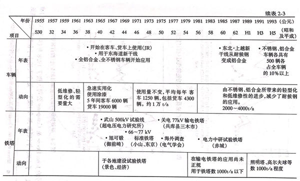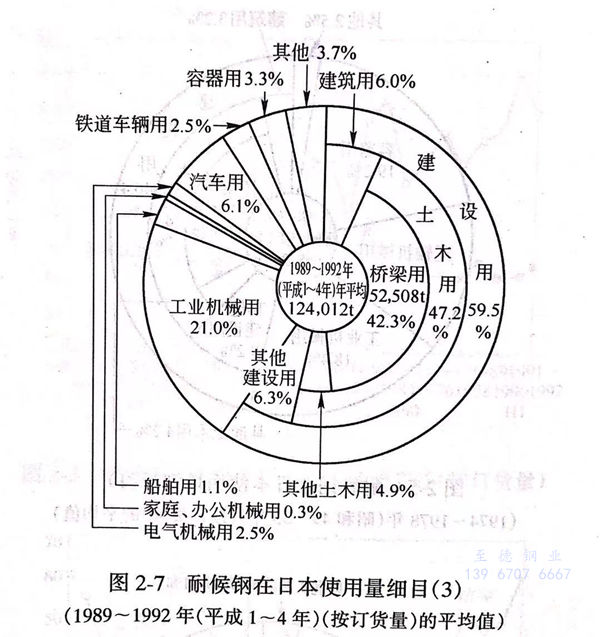 下一節以(yi)后將按用途使(shi)用的動向(xiang)敘(xu)述。在表2-3中,以年(nian)(nian)(nian)表示出了(le)耐候(hou)鋼(gang)40年(nian)(nian)(nian)間的(de)動向。并且在圖2-3及圖2-4上示出了(le)日本鋼(gang)材使用量的(de)變(bian)化。圖2-5~圖2-7是以圓形圖表示的(de)1974~1978年(nian)(nian)(nian)(昭(zhao)(zhao)和49~昭(zhao)(zhao)和53年(nian)(nian)(nian))、1985年(nian)(nian)(nian)(昭(zhao)(zhao)和60年(nian)(nian)(nian))以及1989~1992年(nian)(nian)(nian)(平成元年(nian)(nian)(nian)~平成4年(nian)(nian)(nian))的(de)用途比率(lv)。