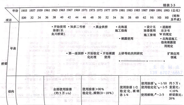 每(mei)座橋梁的使用(yong)鋼(gang)材(cai)量比(bi)較大,經(jing)常保持在按(an)用(yong)途(tu)使用(yong)量的首位。20世紀(ji)70~80年代(昭和50年代)后(hou)期(qi)幾乎都是涂(tu)漆使用(yong)。然而以后(hou)由于補(bu)修涂(tu)漆、再涂(tu)漆在橋梁整體上出(chu)現了費用(yong)問題(ti),并(bing)且隨著技(ji)術(shu)的進(jin)步、腐蝕環境的改(gai)善等(deng),逐漸地使無(wu)涂(tu)漆使用(yong)成為了中(zhong)心。