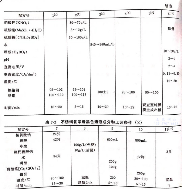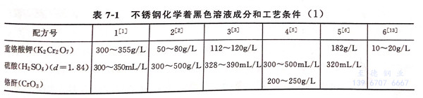 不銹鋼化學著黑(hei)色溶液(ye)成分(fen)和(he)工(gong)藝條件見(jian)表7-1和(he)表7-2.