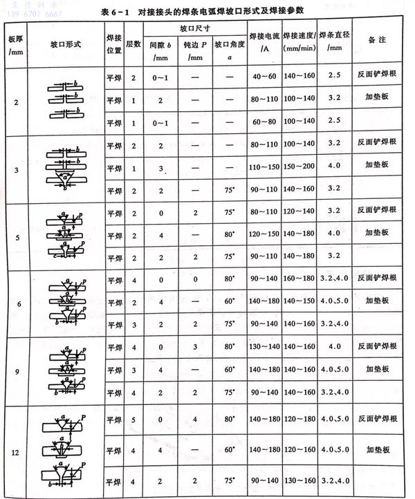 不銹(xiu)鋼(gang)焊(han)(han)接(jie)(jie)(jie)的(de)(de)(de)坡口(kou)(kou)選擇很關鍵。坡口(kou)(kou)形(xing)式(shi)的(de)(de)(de)選擇原則是保(bao)(bao)證焊(han)(han)接(jie)(jie)(jie)接(jie)(jie)(jie)頭質量(liang)(liang),保(bao)(bao)證焊(han)(han)透和盡(jin)量(liang)(liang)避免產(chan)生焊(han)(han)接(jie)(jie)(jie)缺陷和焊(han)(han)接(jie)(jie)(jie)變形(xing),盡(jin)可能減少焊(han)(han)接(jie)(jie)(jie)材料的(de)(de)(de)消耗量(liang)(liang),同(tong)時必須(xu)確保(bao)(bao)工藝的(de)(de)(de)可操作性。在板厚小于(yu)3mm時不用開坡口(kou)(kou);當板厚大(da)于(yu)3mm時可選用V形(xing)坡口(kou)(kou);厚度更大(da)(20mm以(yi)上)時可用X形(xing)坡口(kou)(kou)或U形(xing)坡口(kou)(kou)。表6-1是常見焊(han)(han)條電(dian)弧(hu)焊(han)(han)坡口(kou)(kou)形(xing)式(shi)。