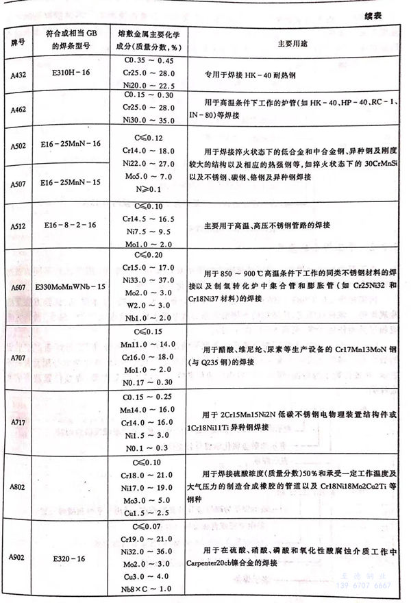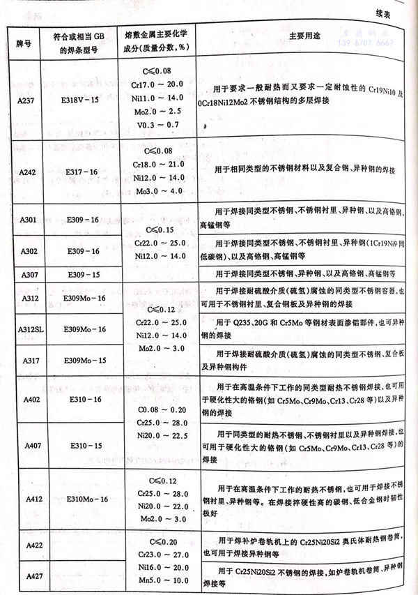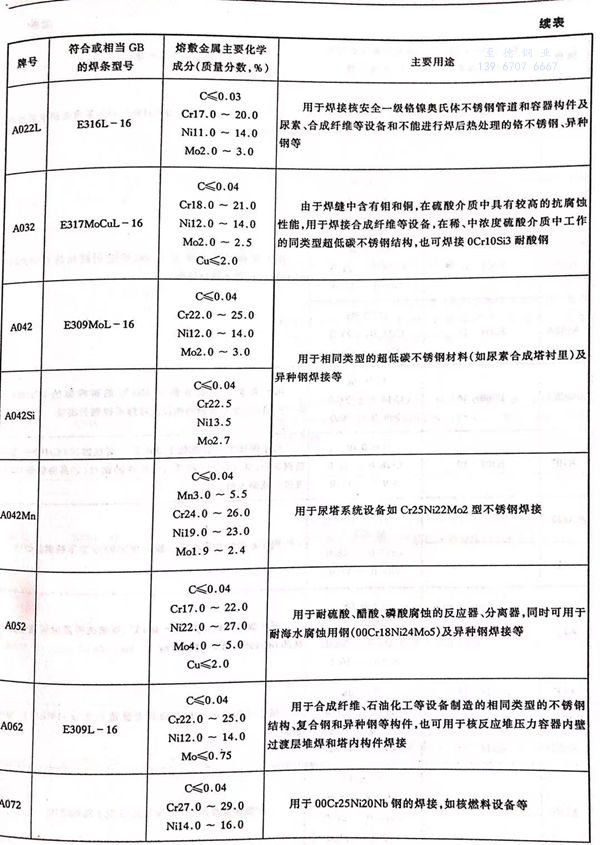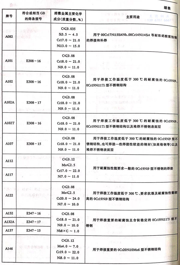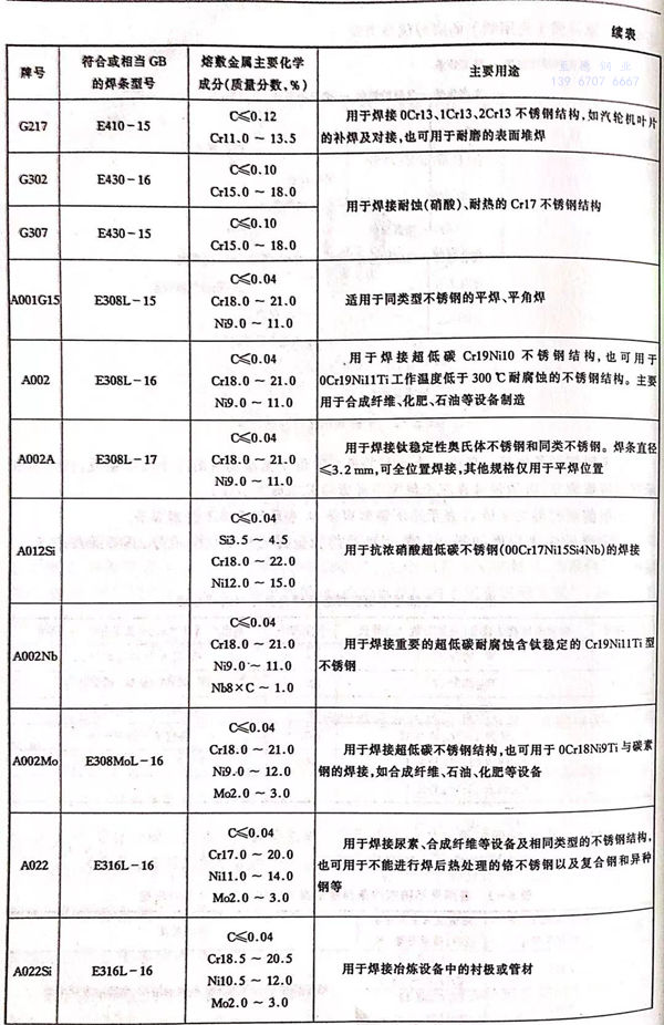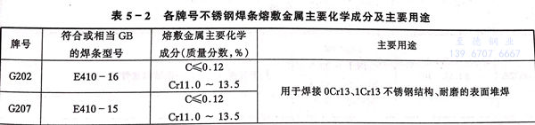 表5-2 各牌號不銹鋼焊條熔敷金屬主要化(hua)學成分(fen)及(ji)主要用途