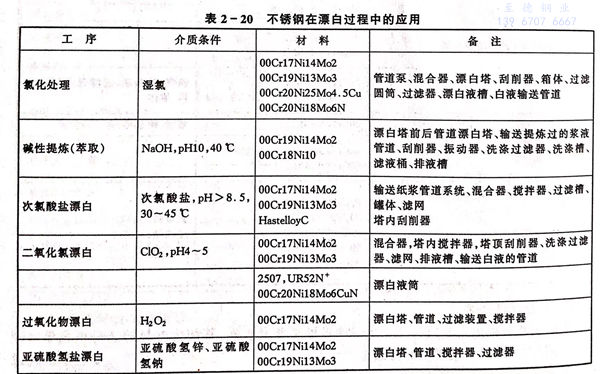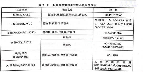 00Cr20Ni25Mo4.5Cu,00Cr20Ni18Mo6CuN,超級雙相不(bu)銹(xiu)鋼(gang)以及鎳基耐(nai)蝕合等(deng)高擋材(cai)料均得到普遍應用,可根(gen)據介質的實際條件(jian)進行合理選擇。不(bu)銹(xiu)鋼(gang)在漂白工(gong)藝過(guo)程(cheng)的使用見表(biao)2-20和表(biao)2-21。