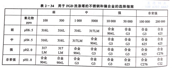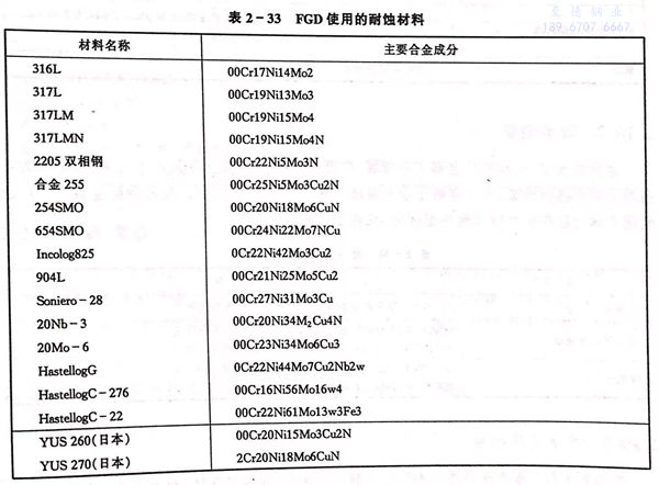 在煙氣脫硫裝置中所使用的耐蝕材料涉及到一般不銹(xiu)鋼、高性能不銹鋼以及鎳基耐蝕合(he)金(jin),見表2-33.可根據介質條件進行合理選擇。通常按表2-34所列原則選擇煙氣脫硫不同裝置的耐蝕材料。