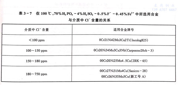 在磷肥生產中,廣泛使用價格便宜的濕法磷酸,這種磷酸含有F-、CI-、SO2-4、Fe3+、Al3+、Mg2+等,除Fe3+外均有加速不(bu)銹鋼腐蝕的作用,其中Cl-、F-尤為強烈。大量的研究表明,在濕法磷酸環境中,高鉻、鉬的奧氏體不銹鋼較為適用。在實際生產中,濕法磷酸中的F-約為0.5%,氯離子的含量卻在較大范圍內變動。因此濕法磷酸中的耐蝕材料選擇主要受介質溫度和Cl-含量的控制。在90℃,含100ppm Cl-的濕法磷酸中,含2%~4%Mo的0Cr17Ni12Mo2、00Cr17Ni14Mo2、0Cr19Ni13Mo3、00Cr19Ni13Mo3的腐蝕率為0.15mm/a,屬可用范圍,見圖3-7。隨溫度的提高和介質中Cl-含量的增加,此類不銹鋼已不具備足夠耐蝕性。一些材料在濕法磷酸中選擇與介質Cl-含量的關系見表3-7。