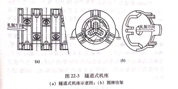PQF軋(ya)(ya)機(ji)由許多圓(yuan)(yuan)(yuan)牌坊(fang)(fang)組成,每(mei)3個軋(ya)(ya)輥(gun)(gun)裝在(zai)(zai)一(yi)(yi)個圓(yuan)(yuan)(yuan)牌坊(fang)(fang)架(jia)里(li)組成一(yi)(yi)個機(ji)架(jia)(參見圖(tu)22-2).圓(yuan)(yuan)(yuan)牌坊(fang)(fang)架(jia)在(zai)(zai)背面(mian)是(shi)敞開(kai)的(de),當圓(yuan)(yuan)(yuan)牌坊(fang)(fang)裝入隧道式機(ji)座內(nei)時(參見圖(tu)22-3),圓(yuan)(yuan)(yuan)牌坊(fang)(fang)的(de)平面(mian)承受軋(ya)(ya)制負荷(he),并把(ba)它傳遞給(gei)機(ji)座。每(mei)一(yi)(yi)個軋(ya)(ya)輥(gun)(gun)箱通過擺臂(bei)和(he)銷釘裝在(zai)(zai)圓(yuan)(yuan)(yuan)牌坊(fang)(fang)里(li),而前一(yi)(yi)個圓(yuan)(yuan)(yuan)牌坊(fang)(fang)的(de)軋(ya)(ya)輥(gun)(gun)箱在(zai)(zai)后一(yi)(yi)個圓(yuan)(yuan)(yuan)牌坊(fang)(fang)的(de)圓(yuan)(yuan)(yuan)平面(mian)上(shang)滑動。