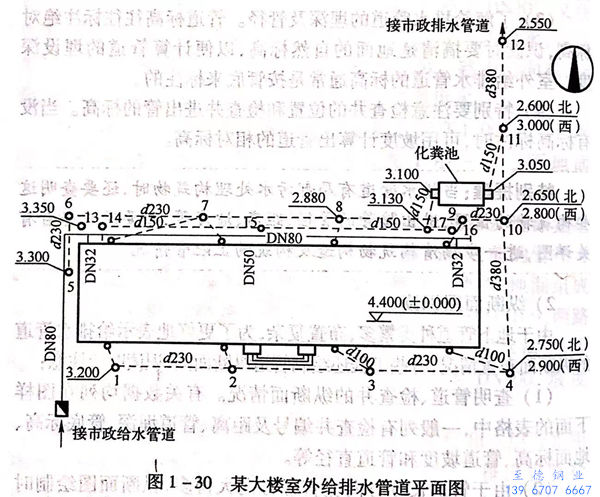 ①. 查明管路平面布置與走向。通常給水管道用粗實線表示,排水管道用粗虛線表示,檢查井用直徑2mm~3mm的小圓表示。給水管道的走向是從大管徑到小管徑,通向建筑物;排水管的走向從建筑物出來到檢查井,各檢查井之間從高標高到低標高,管徑從小到大。