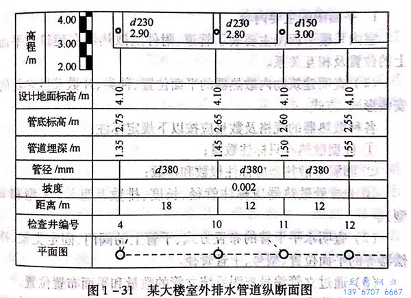 某大(da)樓(lou)室(shi)外(wai)給排(pai)水管道平(ping)面(mian)圖和縱(zong)斷面(mian)圖見圖1-30、圖1-31。