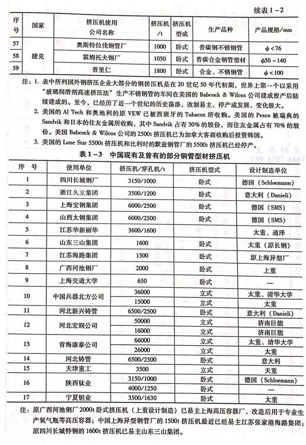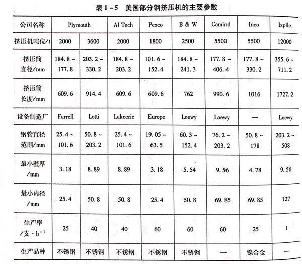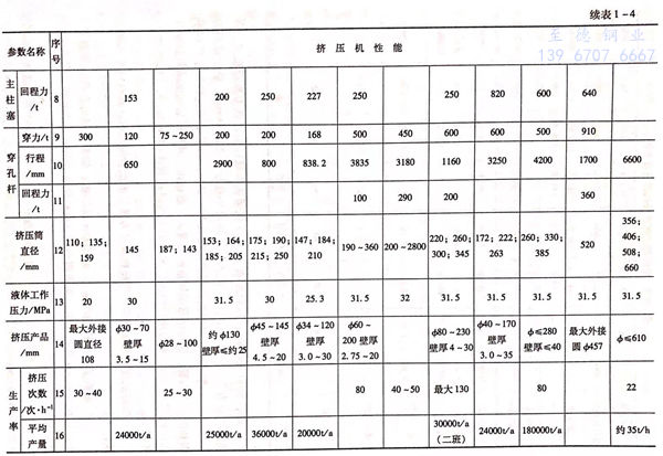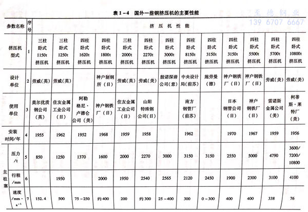表(biao)(biao)(biao)1-2為(wei)國(guo)外部(bu)分(fen)國(guo)家(jia)和公司(si)的擠壓(ya)機,表(biao)(biao)(biao)1-3為(wei)中國(guo)的部(bu)分(fen)鋼管型材擠壓(ya)機。表(biao)(biao)(biao)1-4為(wei)國(guo)外一些鋼擠壓(ya)機的主要性能,表(biao)(biao)(biao)1-5為(wei)美國(guo)部(bu)分(fen)鋼擠壓(ya)的主要參數。