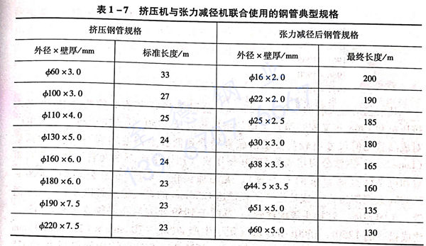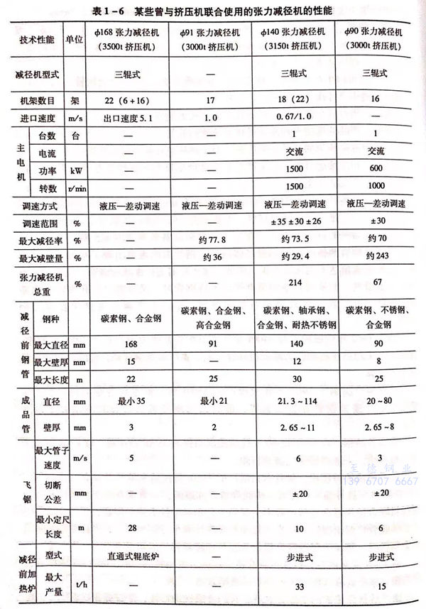 表1-6為(wei)某些(xie)曾(ceng)與擠(ji)壓機(ji)(ji)(ji)聯合使用的(de)張力減(jian)徑機(ji)(ji)(ji)的(de)性能,表1-7為(wei)擠(ji)壓機(ji)(ji)(ji)曾(ceng)與張力減(jian)徑機(ji)(ji)(ji)聯合使用生(sheng)產(chan)鋼管的(de)典型規格。