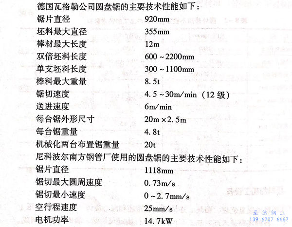 冷圓盤鋸(ju)鋸(ju)切坯料(liao)后(hou)可以得(de)到(dao)光潔的端面(mian)和(he)滿(man)意的垂(chui)直(zhi)度(du)。其鋸(ju)切表面(mian)的粗糙(cao)度(du)R≤80μm;鋸(ju)切平面(mian)與其軸線的垂(chui)直(zhi)度(du)偏差,在(zai)坯料(liao)直(zhi)徑為250mm時,不超過1.0mm;坯料(liao)長(chang)度(du)上的鋸(ju)切精(jing)度(du)為±2.0mm。