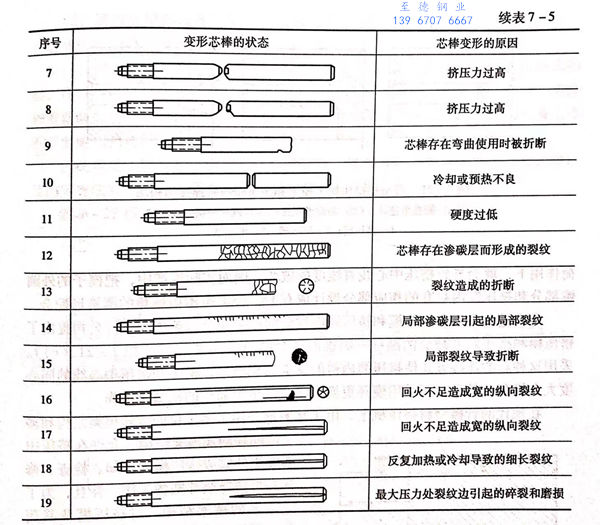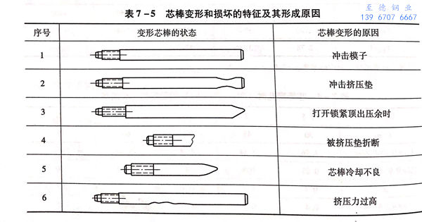 表(biao)7-5中列出了(le)使用在15MN(1500t)和(he)25MN(2500t)臥式(shi)擠壓機上(shang)的(de)中等尺寸芯(xin)棒的(de)幾種變形和(he)損壞的(de)特征。