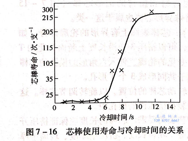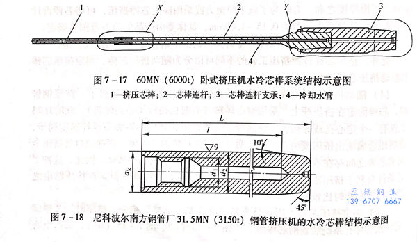 圖7-16所示為芯棒使用壽命與冷卻時間的關系。由圖7-16可知芯棒的冷卻時間越長,冷卻得越充分,其使用壽命越長。圖7-17所示為德國SMS公司設計制造的60MN(6000t)臥式管棒型材擠壓機帶有內水冷裝置的芯棒系統結構。圖7-18所示為尼科波爾南方不銹鋼管廠3150噸鋼管擠壓上采用的水冷芯棒結構。