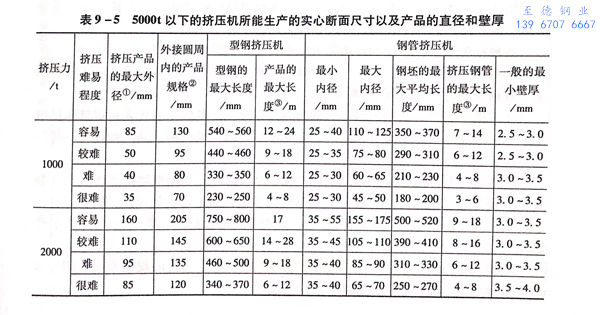 在(zai)5000t以下(包(bao)括(kuo)5000t)的(de)擠壓機(ji)上,所能生產(chan)的(de)實(shi)心斷面(mian)(mian)尺(chi)寸(cun)以及產(chan)品的(de)直徑和(he)壁厚見表9-5。但表9-5僅是(shi)一個大概情況,因為實(shi)際生產(chan)的(de)斷面(mian)(mian)尺(chi)寸(cun)與坯料的(de)質量、生產(chan)數量等因素(su)有關。