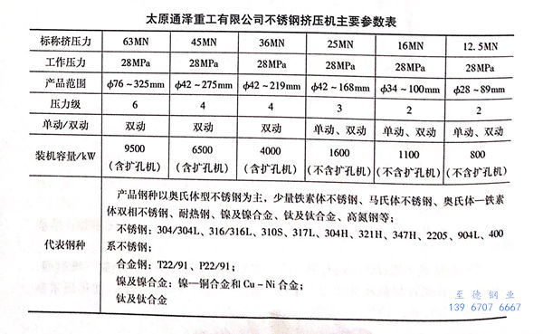 太原通澤重工有限公司設計制造的36MN不銹鋼管熱擠壓生產線于2010年8月21日在常熟華新特殊鋼有限公司熱試擠壓成功并投入使用。該生產線采用ф170mm、φ210mm、φ270mm、φ345mm擠壓筒系統,成功擠出φ51mm×4mm~ф244mm×20mm等數十種規格的鋼管產品,材質范圍覆蓋了“300系列”不銹鋼及904L不(bu)銹鋼、800合金、811、825合金、UNSS92108 高氮鋼等特種合金和鈦合金。該生產線解決了以往穿孔機組無法涉及的材質領域,為擴大產品范圍提供了有力的平臺,對提高我國核電工業、石油化工、航空航天、艦船等特殊領域用管的質量具有積極的促進作用。