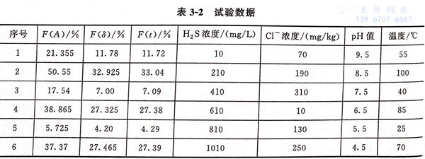 本案例分析是根據文獻的試驗數據進行應力腐蝕影響因素顯著性分析。試驗選用壓力容器常用材料316不(bu)銹鋼(gang),采用慢應變速率拉伸試驗方法。試驗考慮濕硫化氫環境中硫化氫和氯離子濃度、溫度、pH值對應力腐蝕敏感性的影響,試驗介質中各因素的參數值如表3-1所示。