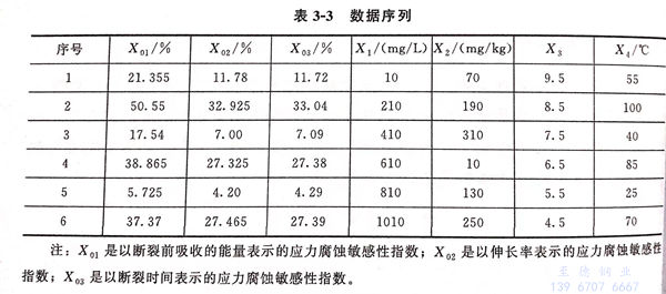 以應力腐蝕敏感性指數F(t)作為參考序列,即表3-3中的X03數列,和應力腐蝕影響因素進行關聯度分析。分析過程如下。