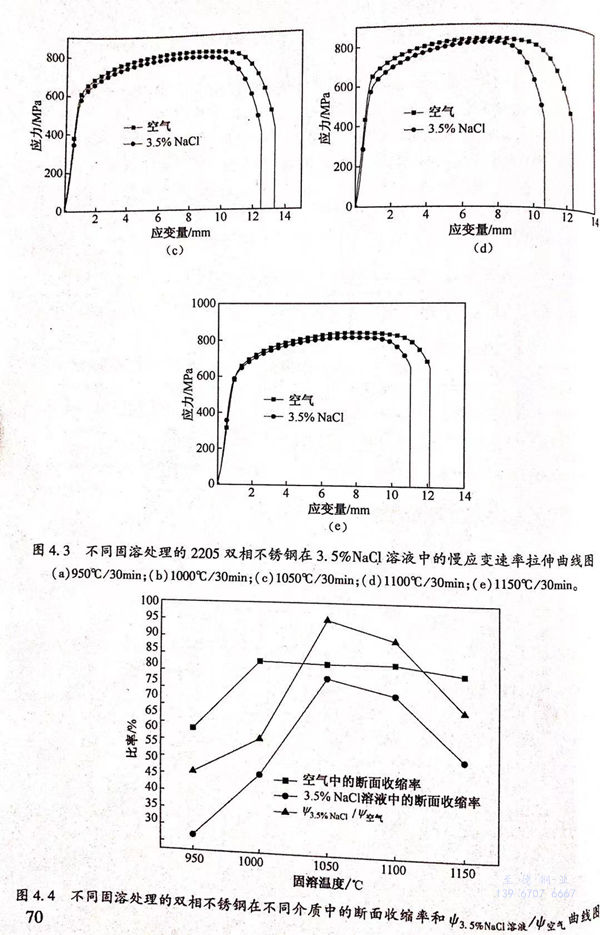 從(cong)表4.2中(zhong)(zhong)也可(ke)(ke)以(yi)(yi)看(kan)(kan)出,950℃/30min 固(gu)(gu)(gu)溶(rong)(rong)(rong)(rong)(rong)處(chu)(chu)理(li)(li)的(de)(de)(de)(de)(de)(de)(de)(de)(de)(de)(de)(de)(de)試(shi)(shi)樣(yang)在(zai)(zai)3.5%NaCl溶(rong)(rong)(rong)(rong)(rong)液(ye)(ye)中(zhong)(zhong)的(de)(de)(de)(de)(de)(de)(de)(de)(de)(de)(de)(de)(de)斷(duan)面收(shou)縮率(lv)僅為(wei)32.0158%,其(qi)(qi)ψ3.5%NaCI溶(rong)(rong)(rong)(rong)(rong)液(ye)(ye)/空氣(qi)也僅為(wei)50.6342%,表現(xian)出很強的(de)(de)(de)(de)(de)(de)(de)(de)(de)(de)(de)(de)(de)應(ying)(ying)力腐(fu)蝕敏感(gan)性(xing)(xing),具(ju)有(you)差(cha)的(de)(de)(de)(de)(de)(de)(de)(de)(de)(de)(de)(de)(de)耐(nai)應(ying)(ying)力腐(fu)蝕性(xing)(xing)能(neng)(neng)(neng)(neng)。而1050℃/30min 固(gu)(gu)(gu)溶(rong)(rong)(rong)(rong)(rong)處(chu)(chu)理(li)(li)的(de)(de)(de)(de)(de)(de)(de)(de)(de)(de)(de)(de)(de)試(shi)(shi)樣(yang)在(zai)(zai)3.5%NaCl 溶(rong)(rong)(rong)(rong)(rong)液(ye)(ye)中(zhong)(zhong)斷(duan)面收(shou)縮率(lv)達到 76.34294%,且(qie)(qie)其(qi)(qi)43.5%NaCI溶(rong)(rong)(rong)(rong)(rong)液(ye)(ye)/空氣(qi)也達到92.5971%,幾(ji)乎無應(ying)(ying)力腐(fu)蝕敏感(gan)性(xing)(xing),表現(xian)出較好(hao)的(de)(de)(de)(de)(de)(de)(de)(de)(de)(de)(de)(de)(de)耐(nai)應(ying)(ying)力腐(fu)蝕性(xing)(xing)能(neng)(neng)(neng)(neng)。1150℃/30min 固(gu)(gu)(gu)溶(rong)(rong)(rong)(rong)(rong)處(chu)(chu)理(li)(li)的(de)(de)(de)(de)(de)(de)(de)(de)(de)(de)(de)(de)(de)試(shi)(shi)樣(yang)的(de)(de)(de)(de)(de)(de)(de)(de)(de)(de)(de)(de)(de)43.5%NaCI溶(rong)(rong)(rong)(rong)(rong)液(ye)(ye)/4空氣(qi)值為(wei)69.7453%,與1050℃/30min 固(gu)(gu)(gu)溶(rong)(rong)(rong)(rong)(rong)處(chu)(chu)理(li)(li)的(de)(de)(de)(de)(de)(de)(de)(de)(de)(de)(de)(de)(de)試(shi)(shi)樣(yang)相比較,有(you)明(ming)顯的(de)(de)(de)(de)(de)(de)(de)(de)(de)(de)(de)(de)(de)下降。將(950℃、1050℃、1150℃)/30min 固(gu)(gu)(gu)溶(rong)(rong)(rong)(rong)(rong)處(chu)(chu)理(li)(li)的(de)(de)(de)(de)(de)(de)(de)(de)(de)(de)(de)(de)(de)試(shi)(shi)樣(yang)的(de)(de)(de)(de)(de)(de)(de)(de)(de)(de)(de)(de)(de)微(wei)觀組織(zhi)進行比較,可(ke)(ke)以(yi)(yi)看(kan)(kan)出,1150℃/30min 固(gu)(gu)(gu)溶(rong)(rong)(rong)(rong)(rong)處(chu)(chu)理(li)(li)的(de)(de)(de)(de)(de)(de)(de)(de)(de)(de)(de)(de)(de)試(shi)(shi)樣(yang)中(zhong)(zhong)的(de)(de)(de)(de)(de)(de)(de)(de)(de)(de)(de)(de)(de)鐵(tie)(tie)素(su)(su)(su)體(ti)百分(fen)(fen)含(han)量(liang)(liang)為(wei)59%,比1050℃/30min 固(gu)(gu)(gu)溶(rong)(rong)(rong)(rong)(rong)處(chu)(chu)理(li)(li)的(de)(de)(de)(de)(de)(de)(de)(de)(de)(de)(de)(de)(de)試(shi)(shi)樣(yang)中(zhong)(zhong)的(de)(de)(de)(de)(de)(de)(de)(de)(de)(de)(de)(de)(de)鐵(tie)(tie)素(su)(su)(su)體(ti)百分(fen)(fen)含(han)量(liang)(liang)(51.9%)高7.1%,并且(qie)(qie)950℃/30min 固(gu)(gu)(gu)溶(rong)(rong)(rong)(rong)(rong)處(chu)(chu)理(li)(li)的(de)(de)(de)(de)(de)(de)(de)(de)(de)(de)(de)(de)(de)試(shi)(shi)樣(yang)中(zhong)(zhong)存在(zai)(zai)大量(liang)(liang)σ相;從(cong)極(ji)化曲線的(de)(de)(de)(de)(de)(de)(de)(de)(de)(de)(de)(de)(de)分(fen)(fen)析可(ke)(ke)知,當(dang)固(gu)(gu)(gu)溶(rong)(rong)(rong)(rong)(rong)處(chu)(chu)理(li)(li)的(de)(de)(de)(de)(de)(de)(de)(de)(de)(de)(de)(de)(de)溫度過高時,鐵(tie)(tie)素(su)(su)(su)體(ti)百分(fen)(fen)含(han)量(liang)(liang)升高,鐵(tie)(tie)素(su)(su)(su)體(ti)耐(nai)點蝕當(dang)量(liang)(liang)下降,促使點蝕更易(yi)于(yu)發生(sheng);且(qie)(qie)當(dang)固(gu)(gu)(gu)溶(rong)(rong)(rong)(rong)(rong)處(chu)(chu)理(li)(li)的(de)(de)(de)(de)(de)(de)(de)(de)(de)(de)(de)(de)(de)溫度為(wei)950℃時,大量(liang)(liang)的(de)(de)(de)(de)(de)(de)(de)(de)(de)(de)(de)(de)(de)σ相的(de)(de)(de)(de)(de)(de)(de)(de)(de)(de)(de)(de)(de)存在(zai)(zai)顯著(zhu)降低了(le)材料的(de)(de)(de)(de)(de)(de)(de)(de)(de)(de)(de)(de)(de)耐(nai)點蝕性(xing)(xing)能(neng)(neng)(neng)(neng)。從(cong)應(ying)(ying)力腐(fu)蝕性(xing)(xing)能(neng)(neng)(neng)(neng)分(fen)(fen)析可(ke)(ke)以(yi)(yi)看(kan)(kan)出,由于(yu)σ相的(de)(de)(de)(de)(de)(de)(de)(de)(de)(de)(de)(de)(de)存在(zai)(zai),950℃/30min 固(gu)(gu)(gu)溶(rong)(rong)(rong)(rong)(rong)處(chu)(chu)理(li)(li)的(de)(de)(de)(de)(de)(de)(de)(de)(de)(de)(de)(de)(de)試(shi)(shi)樣(yang)的(de)(de)(de)(de)(de)(de)(de)(de)(de)(de)(de)(de)(de)耐(nai)應(ying)(ying)力腐(fu)蝕性(xing)(xing)能(neng)(neng)(neng)(neng)比1050℃/30min固(gu)(gu)(gu)溶(rong)(rong)(rong)(rong)(rong)處(chu)(chu)理(li)(li)的(de)(de)(de)(de)(de)(de)(de)(de)(de)(de)(de)(de)(de)試(shi)(shi)樣(yang)的(de)(de)(de)(de)(de)(de)(de)(de)(de)(de)(de)(de)(de)耐(nai)應(ying)(ying)力腐(fu)蝕性(xing)(xing)能(neng)(neng)(neng)(neng)差(cha),以(yi)(yi)及1150℃/30min固(gu)(gu)(gu)溶(rong)(rong)(rong)(rong)(rong)處(chu)(chu)理(li)(li)的(de)(de)(de)(de)(de)(de)(de)(de)(de)(de)(de)(de)(de)試(shi)(shi)樣(yang)中(zhong)(zhong)的(de)(de)(de)(de)(de)(de)(de)(de)(de)(de)(de)(de)(de)過量(liang)(liang)鐵(tie)(tie)素(su)(su)(su)體(ti)導致材料的(de)(de)(de)(de)(de)(de)(de)(de)(de)(de)(de)(de)(de)耐(nai)應(ying)(ying)力腐(fu)蝕性(xing)(xing)能(neng)(neng)(neng)(neng)比1050℃/30min固(gu)(gu)(gu)溶(rong)(rong)(rong)(rong)(rong)處(chu)(chu)理(li)(li)的(de)(de)(de)(de)(de)(de)(de)(de)(de)(de)(de)(de)(de)試(shi)(shi)樣(yang)的(de)(de)(de)(de)(de)(de)(de)(de)(de)(de)(de)(de)(de)耐(nai)應(ying)(ying)力腐(fu)蝕性(xing)(xing)能(neng)(neng)(neng)(neng)有(you)所下降。