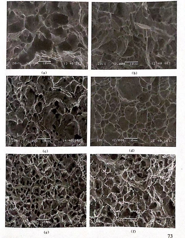 從圖4.5(a)、(b)中(zhong)(zhong)(zhong)可(ke)以看出(chu),950℃/30min固(gu)(gu)溶(rong)(rong)處(chu)理(li)的(de)(de)雙(shuang)(shuang)(shuang)(shuang)相(xiang)不(bu)(bu)銹鋼(gang)(gang)在(zai)(zai)空(kong)氣(qi)中(zhong)(zhong)(zhong)和溶(rong)(rong)液(ye)中(zhong)(zhong)(zhong)的(de)(de)斷(duan)口(kou)(kou)均呈現準(zhun)解理(li)平(ping)面;950℃/30min 固(gu)(gu)溶(rong)(rong)處(chu)理(li)的(de)(de)雙(shuang)(shuang)(shuang)(shuang)相(xiang)不(bu)(bu)銹鋼(gang)(gang)在(zai)(zai)空(kong)氣(qi)中(zhong)(zhong)(zhong)的(de)(de)斷(duan)口(kou)(kou)局部有少量韌窩存在(zai)(zai),而(er)在(zai)(zai)溶(rong)(rong)液(ye)中(zhong)(zhong)(zhong)的(de)(de)斷(duan)口(kou)(kou)幾乎是準(zhun)解理(li)平(ping)面,二(er)者都(dou)屬于脆性(xing)(xing)斷(duan)裂,這主要(yao)是由于大量脆性(xing)(xing)σ相(xiang)沿著(zhu)晶界析出(chu),降低了材料的(de)(de)耐應(ying)力腐(fu)蝕性(xing)(xing)能(neng)和力學性(xing)(xing)能(neng)。從圖4.5(e)、(f)中(zhong)(zhong)(zhong)可(ke)以看出(chu),1050℃/30min固(gu)(gu)溶(rong)(rong)處(chu)理(li)的(de)(de)雙(shuang)(shuang)(shuang)(shuang)相(xiang)不(bu)(bu)銹鋼(gang)(gang)在(zai)(zai)空(kong)氣(qi)和溶(rong)(rong)液(ye)中(zhong)(zhong)(zhong)的(de)(de)斷(duan)口(kou)(kou)都(dou)存在(zai)(zai)大量韌窩,雙(shuang)(shuang)(shuang)(shuang)相(xiang)不(bu)(bu)銹鋼(gang)(gang)在(zai)(zai)溶(rong)(rong)液(ye)中(zhong)(zhong)(zhong)的(de)(de)韌性(xing)(xing)損(sun)失較小,而(er)(950℃、1000℃、1100℃、1150℃)/30min 固(gu)(gu)溶(rong)(rong)處(chu)理(li)的(de)(de)雙(shuang)(shuang)(shuang)(shuang)相(xiang)不(bu)(bu)銹鋼(gang)(gang)在(zai)(zai)溶(rong)(rong)液(ye)中(zhong)(zhong)(zhong)都(dou)存在(zai)(zai)較大的(de)(de)韌性(xing)(xing)損(sun)失,表明1050℃/30min 固(gu)(gu)溶(rong)(rong)處(chu)理(li)的(de)(de)雙(shuang)(shuang)(shuang)(shuang)相(xiang)不(bu)(bu)銹鋼(gang)(gang)具(ju)有較好(hao)的(de)(de)耐應(ying)力腐(fu)蝕性(xing)(xing)能(neng)。