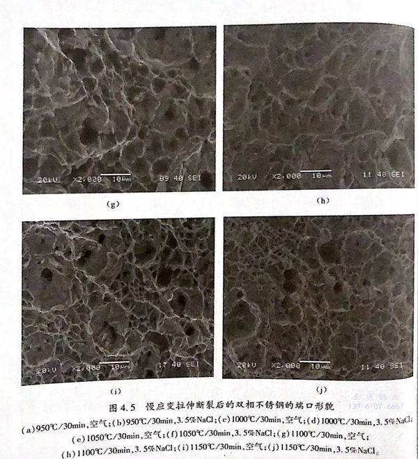 從(cong)表(biao)4.2中(zhong)(zhong)(zhong)可(ke)以(yi)看出,當(dang)(dang)(dang)固(gu)(gu)溶(rong)(rong)(rong)處(chu)(chu)理(li)(li)(li)(li)的(de)(de)(de)(de)(de)溫(wen)度(du)(du)從(cong)950℃升(sheng)高(gao)(gao)(gao)至(zhi)(zhi)(zhi)1000℃時(shi),雙(shuang)相(xiang)不(bu)(bu)銹(xiu)鋼(gang)(gang)在(zai)空(kong)(kong)(kong)氣(qi)(qi)(qi)(qi)中(zhong)(zhong)(zhong)的(de)(de)(de)(de)(de)斷(duan)(duan)(duan)面(mian)收(shou)縮(suo)(suo)(suo)(suo)率(lv)從(cong)63.22956%升(sheng)高(gao)(gao)(gao)至(zhi)(zhi)(zhi)82.92134%,升(sheng)高(gao)(gao)(gao)幅值約(yue)為(wei)(wei)19%;當(dang)(dang)(dang)固(gu)(gu)溶(rong)(rong)(rong)處(chu)(chu)理(li)(li)(li)(li)的(de)(de)(de)(de)(de)溫(wen)度(du)(du)升(sheng)高(gao)(gao)(gao)到1050℃時(shi),雙(shuang)相(xiang)不(bu)(bu)銹(xiu)鋼(gang)(gang)在(zai)空(kong)(kong)(kong)氣(qi)(qi)(qi)(qi)中(zhong)(zhong)(zhong)斷(duan)(duan)(duan)面(mian)收(shou)縮(suo)(suo)(suo)(suo)率(lv)為(wei)(wei)82.50531%;當(dang)(dang)(dang)固(gu)(gu)溶(rong)(rong)(rong)處(chu)(chu)理(li)(li)(li)(li)的(de)(de)(de)(de)(de)溫(wen)度(du)(du)為(wei)(wei)1100℃時(shi),雙(shuang)相(xiang)不(bu)(bu)銹(xiu)鋼(gang)(gang)在(zai)空(kong)(kong)(kong)氣(qi)(qi)(qi)(qi)中(zhong)(zhong)(zhong)斷(duan)(duan)(duan)面(mian)收(shou)縮(suo)(suo)(suo)(suo)率(lv)為(wei)(wei)82.67233%;進一(yi)步升(sheng)高(gao)(gao)(gao)固(gu)(gu)溶(rong)(rong)(rong)處(chu)(chu)理(li)(li)(li)(li)的(de)(de)(de)(de)(de)溫(wen)度(du)(du)至(zhi)(zhi)(zhi)1150℃時(shi),雙(shuang)相(xiang)不(bu)(bu)銹(xiu)鋼(gang)(gang)在(zai)空(kong)(kong)(kong)氣(qi)(qi)(qi)(qi)中(zhong)(zhong)(zhong)斷(duan)(duan)(duan)面(mian)收(shou)縮(suo)(suo)(suo)(suo)率(lv)為(wei)(wei)80.08303%.可(ke)以(yi)看出,當(dang)(dang)(dang)固(gu)(gu)溶(rong)(rong)(rong)處(chu)(chu)理(li)(li)(li)(li)的(de)(de)(de)(de)(de)溫(wen)度(du)(du)從(cong)1000℃升(sheng)高(gao)(gao)(gao)至(zhi)(zhi)(zhi)1100℃時(shi),雙(shuang)相(xiang)不(bu)(bu)銹(xiu)鋼(gang)(gang)在(zai)空(kong)(kong)(kong)氣(qi)(qi)(qi)(qi)中(zhong)(zhong)(zhong)的(de)(de)(de)(de)(de)斷(duan)(duan)(duan)面(mian)收(shou)縮(suo)(suo)(suo)(suo)率(lv)幾乎沒(mei)有(you)變化(hua),當(dang)(dang)(dang)固(gu)(gu)溶(rong)(rong)(rong)處(chu)(chu)理(li)(li)(li)(li)的(de)(de)(de)(de)(de)溫(wen)度(du)(du)升(sheng)高(gao)(gao)(gao)至(zhi)(zhi)(zhi)1150℃時(shi),雙(shuang)相(xiang)不(bu)(bu)銹(xiu)鋼(gang)(gang)在(zai)空(kong)(kong)(kong)氣(qi)(qi)(qi)(qi)中(zhong)(zhong)(zhong)斷(duan)(duan)(duan)面(mian)收(shou)縮(suo)(suo)(suo)(suo)率(lv)開始下(xia)(xia)(xia)降(jiang)至(zhi)(zhi)(zhi)80.08303%,這(zhe)與1150℃/30min固(gu)(gu)溶(rong)(rong)(rong)處(chu)(chu)理(li)(li)(li)(li)的(de)(de)(de)(de)(de)試(shi)樣(yang)(yang)(yang)中(zhong)(zhong)(zhong)的(de)(de)(de)(de)(de)鐵素體(ti)和奧(ao)氏體(ti)的(de)(de)(de)(de)(de)百分(fen)(fen)含量(liang)(liang)有(you)關(guan),此時(shi)的(de)(de)(de)(de)(de)鐵素體(ti)的(de)(de)(de)(de)(de)百分(fen)(fen)含量(liang)(liang)為(wei)(wei)59%,而奧(ao)氏體(ti)的(de)(de)(de)(de)(de)百分(fen)(fen)含量(liang)(liang)為(wei)(wei)41%,即1150℃/30min 固(gu)(gu)溶(rong)(rong)(rong)處(chu)(chu)理(li)(li)(li)(li)的(de)(de)(de)(de)(de)試(shi)樣(yang)(yang)(yang)中(zhong)(zhong)(zhong)含有(you)過量(liang)(liang)的(de)(de)(de)(de)(de)強度(du)(du)高(gao)(gao)(gao)的(de)(de)(de)(de)(de)鐵素體(ti),以(yi)及不(bu)(bu)足量(liang)(liang)的(de)(de)(de)(de)(de)塑性優(you)的(de)(de)(de)(de)(de)奧(ao)氏體(ti),導致該(gai)固(gu)(gu)溶(rong)(rong)(rong)處(chu)(chu)理(li)(li)(li)(li)狀(zhuang)態下(xia)(xia)(xia)的(de)(de)(de)(de)(de)試(shi)樣(yang)(yang)(yang)在(zai)空(kong)(kong)(kong)氣(qi)(qi)(qi)(qi)中(zhong)(zhong)(zhong)的(de)(de)(de)(de)(de)斷(duan)(duan)(duan)面(mian)收(shou)縮(suo)(suo)(suo)(suo)率(lv)有(you)所下(xia)(xia)(xia)降(jiang)。對(dui)于950℃固(gu)(gu)溶(rong)(rong)(rong)處(chu)(chu)理(li)(li)(li)(li)的(de)(de)(de)(de)(de)試(shi)樣(yang)(yang)(yang),其含有(you)6.1%的(de)(de)(de)(de)(de)硬而脆的(de)(de)(de)(de)(de)σ相(xiang),這(zhe)必然導致該(gai)固(gu)(gu)溶(rong)(rong)(rong)處(chu)(chu)理(li)(li)(li)(li)狀(zhuang)態下(xia)(xia)(xia)的(de)(de)(de)(de)(de)試(shi)樣(yang)(yang)(yang)的(de)(de)(de)(de)(de)斷(duan)(duan)(duan)面(mian)收(shou)縮(suo)(suo)(suo)(suo)率(lv)明顯降(jiang)低,僅(jin)為(wei)(wei)63.22956%。