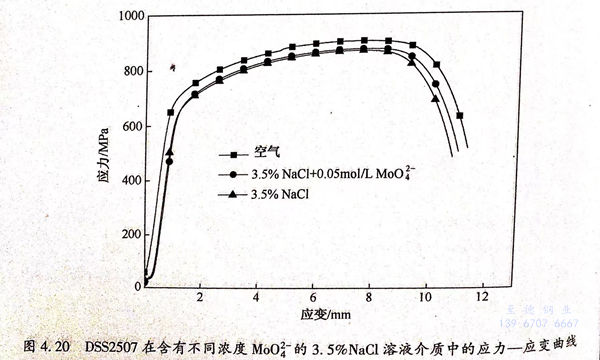鉬酸根離子對2507不銹鋼應力腐蝕敏感性的影響與2205雙相不銹鋼相似,其于室溫下在含有不同濃度鉬酸根離子的3.5%NaCl溶液中SSRT結果如圖4.20和表4.7所示。從圖4.20中可以很明顯地看出試樣在空氣中的抗拉強度和拉伸應變量都較高,在含有0.05mol/L MoO2-4的3.5%NaCl溶液中的抗拉強度和拉伸應變次之,而試樣于3.5%NaCl溶液介質中的抗拉強度和拉伸應變均較小,具體數值如表4.7所列。從表4.7中可以看出試樣在3.5%Nac溶液中的抗拉強度為863.573MPa,比在空氣中減小了26.183MPa;試樣在含有0.05mol/LMoO3的3.5%NaCl溶液中的抗拉強度為877.341MPa,比在空氣中減小了12.415MPa,減小幅度小于鋼在3.5%NaCl介質中的抗拉強度;除此之外,2507不銹鋼在含有0.05mol/L MoO2-4溶液中斷裂時的應變以及斷裂時間分別為11.0336mm、30.07h,而在3.5%NaCl溶液中斷裂時的應變以及斷裂時間分別是10.9623mm、29.49h,可以看出在鉬酸根離子的作用下,試樣的斷裂時間和斷裂時的應變值都比在3.5%NaCl溶液中高斷裂時的應變都較高。
