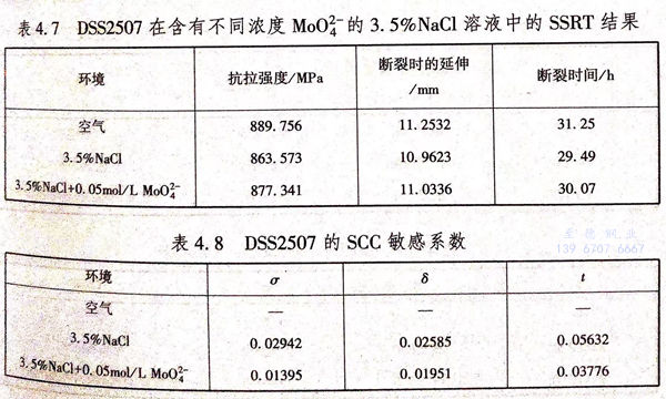 鉬酸根離子對不銹鋼的點蝕抑制作用一直被研究,G.O.Ilevbare指出鉬酸根離子可以通過控制亞穩態的點蝕(shi)和穩定點蝕來提高耐蝕性能。S.A.M.Refaey 發現無機鉬酸鹽通過增加點蝕電位來阻止酸性和氯化物溶液中的點蝕發生。因此,鉬酸根離子相當于一種抑制劑,一定含量的抑制劑可以減緩腐蝕的發生,而鉬酸根與雙相不(bu)銹鋼(gang)應力腐蝕敏感性關系的研究目前報道很少,本節采用慢應變拉伸的方法,分別討論鉬酸根離子對2205和2507兩種牌號雙相不銹鋼的應力腐蝕敏感性影響。