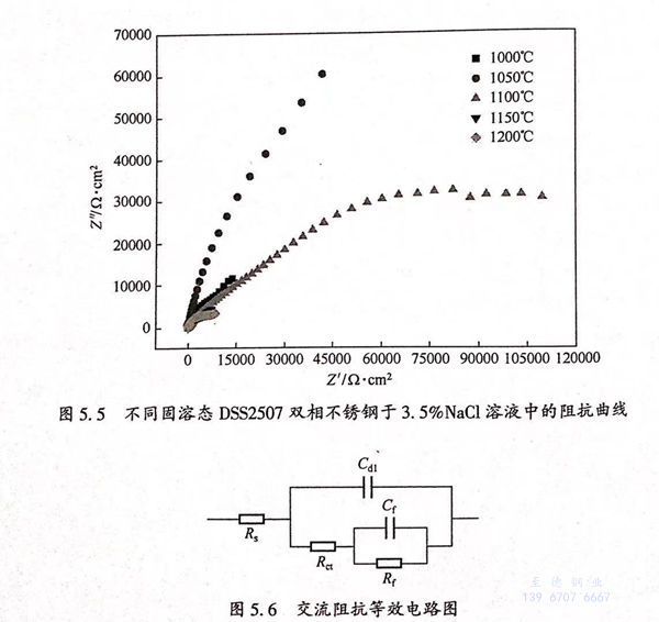 1000℃、1050℃、1100℃、1150℃及1200℃固(gu)(gu)(gu)溶(rong)(rong)(rong)(rong)(rong)(rong)態的(de)(de)(de)(de)(de)(de)(de)(de)2507 雙(shuang)(shuang)(shuang)相(xiang)(xiang)(xiang)不銹(xiu)(xiu)(xiu)鋼(gang)30℃下于(yu)3.5%NaCl溶(rong)(rong)(rong)(rong)(rong)(rong)液(ye)(ye)中(zhong)(zhong)(zhong)的(de)(de)(de)(de)(de)(de)(de)(de)Nyquist 圖如圖5.5所(suo)(suo)示(shi),從(cong)圖中(zhong)(zhong)(zhong)可(ke)以很明顯看出隨(sui)固(gu)(gu)(gu)溶(rong)(rong)(rong)(rong)(rong)(rong)熱(re)處(chu)理(li)(li)溫(wen)(wen)度的(de)(de)(de)(de)(de)(de)(de)(de)增(zeng)(zeng)(zeng)高(gao)容(rong)(rong)抗(kang)(kang)(kang)(kang)(kang)(kang)弧半(ban)(ban)徑先(xian)(xian)增(zeng)(zeng)(zeng)大(da)后(hou)(hou)(hou)減(jian)(jian)小,1050℃時(shi)容(rong)(rong)抗(kang)(kang)(kang)(kang)(kang)(kang)弧半(ban)(ban)徑最大(da)。通常(chang)情(qing)況下界面(mian)間電(dian)(dian)(dian)荷(he)(he)的(de)(de)(de)(de)(de)(de)(de)(de)遷移(yi)(yi)促進(jin)(jin)了高(gao)頻區容(rong)(rong)抗(kang)(kang)(kang)(kang)(kang)(kang)弧的(de)(de)(de)(de)(de)(de)(de)(de)形(xing)成,容(rong)(rong)抗(kang)(kang)(kang)(kang)(kang)(kang)弧與雙(shuang)(shuang)(shuang)電(dian)(dian)(dian)層(ceng)容(rong)(rong)抗(kang)(kang)(kang)(kang)(kang)(kang)及金(jin)屬(shu)(shu)材料(liao)溶(rong)(rong)(rong)(rong)(rong)(rong)解的(de)(de)(de)(de)(de)(de)(de)(de)綜(zong)合作(zuo)用有(you)關,并且(qie)金(jin)屬(shu)(shu)-溶(rong)(rong)(rong)(rong)(rong)(rong)液(ye)(ye)界面(mian)的(de)(de)(de)(de)(de)(de)(de)(de)電(dian)(dian)(dian)荷(he)(he)轉(zhuan)移(yi)(yi)電(dian)(dian)(dian)阻(zu)(zu)(zu)影響著(zhu)容(rong)(rong)抗(kang)(kang)(kang)(kang)(kang)(kang)弧半(ban)(ban)徑的(de)(de)(de)(de)(de)(de)(de)(de)大(da)小,電(dian)(dian)(dian)荷(he)(he)在金(jin)屬(shu)(shu)-溶(rong)(rong)(rong)(rong)(rong)(rong)液(ye)(ye)界面(mian)轉(zhuan)移(yi)(yi)時(shi)受到的(de)(de)(de)(de)(de)(de)(de)(de)阻(zu)(zu)(zu)力越(yue)(yue)強意(yi)(yi)味(wei)著(zhu)容(rong)(rong)抗(kang)(kang)(kang)(kang)(kang)(kang)弧半(ban)(ban)徑越(yue)(yue)大(da),即意(yi)(yi)味(wei)著(zhu)金(jin)屬(shu)(shu)的(de)(de)(de)(de)(de)(de)(de)(de)抗(kang)(kang)(kang)(kang)(kang)(kang)蝕性能(neng)(neng)(neng)越(yue)(yue)優。從(cong)圖5.5容(rong)(rong)抗(kang)(kang)(kang)(kang)(kang)(kang)弧半(ban)(ban)徑的(de)(de)(de)(de)(de)(de)(de)(de)改變趨(qu)勢可(ke)知,固(gu)(gu)(gu)溶(rong)(rong)(rong)(rong)(rong)(rong)熱(re)處(chu)理(li)(li)溫(wen)(wen)度升(sheng)高(gao)使DSS2507的(de)(de)(de)(de)(de)(de)(de)(de)耐(nai)蝕性能(neng)(neng)(neng)首(shou)先(xian)(xian)增(zeng)(zeng)(zeng)強而(er)后(hou)(hou)(hou)減(jian)(jian)弱(ruo)(ruo),1050℃時(shi)2507雙(shuang)(shuang)(shuang)相(xiang)(xiang)(xiang)不銹(xiu)(xiu)(xiu)鋼(gang)的(de)(de)(de)(de)(de)(de)(de)(de)抗(kang)(kang)(kang)(kang)(kang)(kang)腐(fu)蝕性能(neng)(neng)(neng)最優。不同固(gu)(gu)(gu)溶(rong)(rong)(rong)(rong)(rong)(rong)態的(de)(de)(de)(de)(de)(de)(de)(de)2507雙(shuang)(shuang)(shuang)相(xiang)(xiang)(xiang)不銹(xiu)(xiu)(xiu)鋼(gang)于(yu)3.5%NaCl溶(rong)(rong)(rong)(rong)(rong)(rong)液(ye)(ye)中(zhong)(zhong)(zhong)的(de)(de)(de)(de)(de)(de)(de)(de)等(deng)效電(dian)(dian)(dian)路(lu)(lu)如圖5.6所(suo)(suo)示(shi),采用的(de)(de)(de)(de)(de)(de)(de)(de)是R(C(R(CR))).Rs指(zhi)參比(bi)電(dian)(dian)(dian)極和工(gong)作(zuo)電(dian)(dian)(dian)極間的(de)(de)(de)(de)(de)(de)(de)(de)溶(rong)(rong)(rong)(rong)(rong)(rong)液(ye)(ye)電(dian)(dian)(dian)阻(zu)(zu)(zu);Cd1為(wei)雙(shuang)(shuang)(shuang)電(dian)(dian)(dian)層(ceng)電(dian)(dian)(dian)容(rong)(rong);Rct為(wei)電(dian)(dian)(dian)荷(he)(he)轉(zhuan)移(yi)(yi)電(dian)(dian)(dian)阻(zu)(zu)(zu),其值能(neng)(neng)(neng)夠(gou)反(fan)應(ying)電(dian)(dian)(dian)荷(he)(he)在電(dian)(dian)(dian)化(hua)(hua)(hua)學反(fan)應(ying)過(guo)程中(zhong)(zhong)(zhong)透(tou)過(guo)電(dian)(dian)(dian)極以及于(yu)電(dian)(dian)(dian)解質溶(rong)(rong)(rong)(rong)(rong)(rong)液(ye)(ye)中(zhong)(zhong)(zhong)兩(liang)(liang)相(xiang)(xiang)(xiang)界面(mian)遷移(yi)(yi)難(nan)易的(de)(de)(de)(de)(de)(de)(de)(de)大(da)小,也能(neng)(neng)(neng)夠(gou)反(fan)映金(jin)屬(shu)(shu)發生腐(fu)蝕反(fan)應(ying)的(de)(de)(de)(de)(de)(de)(de)(de)快慢,一(yi)般情(qing)況下Rct值越(yue)(yue)高(gao)意(yi)(yi)味(wei)著(zhu)電(dian)(dian)(dian)荷(he)(he)遷移(yi)(yi)過(guo)程中(zhong)(zhong)(zhong)所(suo)(suo)受的(de)(de)(de)(de)(de)(de)(de)(de)阻(zu)(zu)(zu)力越(yue)(yue)強,即材料(liao)的(de)(de)(de)(de)(de)(de)(de)(de)耐(nai)腐(fu)蝕性能(neng)(neng)(neng)越(yue)(yue)好;Cf表(biao)(biao)(biao)示(shi)鈍化(hua)(hua)(hua)膜(mo)(mo)(mo)(mo)(mo)電(dian)(dian)(dian)容(rong)(rong),Rf表(biao)(biao)(biao)示(shi)鈍化(hua)(hua)(hua)膜(mo)(mo)(mo)(mo)(mo)電(dian)(dian)(dian)阻(zu)(zu)(zu)。采用ZsimpWin軟(ruan)件對等(deng)效電(dian)(dian)(dian)路(lu)(lu)模擬(ni)計算(suan)得到各元(yuan)件的(de)(de)(de)(de)(de)(de)(de)(de)數值如表(biao)(biao)(biao)5.2所(suo)(suo)列。從(cong)表(biao)(biao)(biao)中(zhong)(zhong)(zhong)看出雙(shuang)(shuang)(shuang)電(dian)(dian)(dian)層(ceng)電(dian)(dian)(dian)容(rong)(rong)(Cdl)及鈍化(hua)(hua)(hua)膜(mo)(mo)(mo)(mo)(mo)電(dian)(dian)(dian)容(rong)(rong)(Cr)隨(sui)固(gu)(gu)(gu)溶(rong)(rong)(rong)(rong)(rong)(rong)溫(wen)(wen)度的(de)(de)(de)(de)(de)(de)(de)(de)升(sheng)高(gao)呈先(xian)(xian)減(jian)(jian)小后(hou)(hou)(hou)增(zeng)(zeng)(zeng)大(da)的(de)(de)(de)(de)(de)(de)(de)(de)趨(qu)勢;電(dian)(dian)(dian)荷(he)(he)轉(zhuan)移(yi)(yi)電(dian)(dian)(dian)阻(zu)(zu)(zu)(Rct)和鈍化(hua)(hua)(hua)膜(mo)(mo)(mo)(mo)(mo)電(dian)(dian)(dian)阻(zu)(zu)(zu)(Rf)呈先(xian)(xian)變大(da)后(hou)(hou)(hou)減(jian)(jian)小的(de)(de)(de)(de)