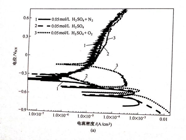 溶液中的陰極反應為H+的還原反應(HER),陽極反應為金屬的溶解反應。根據混合電位理論,H+的還原反應電流密度iH+,和金屬溶解反應的電流密度idiss相等時就會形成一個穩定的自腐蝕電位。也即陰、陽極反應的凈電流密度inet(極化曲線中測量的腐蝕電流密度)是陰、陽極反應的電流密度的代數和為