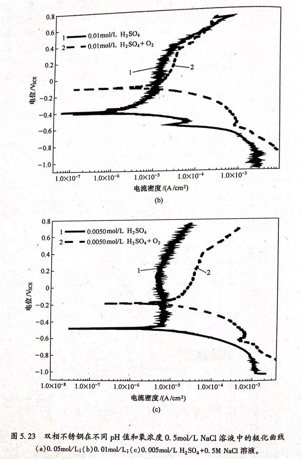 通過改變溶液的硫酸濃度來研究pH值的變化對雙相不銹鋼在H2SO4+0.5mol/L NaCl中的腐蝕行為的影響。圖5.22是不同硫酸濃度條件下雙相不銹鋼在H2SO4+0.5mol/L NaCl溶液中的極化曲線,從極化曲線中擬合的自腐蝕電位和腐蝕電流密度的值列于表5.8中。從圖5.8中可以看出,pH值對雙相不銹鋼在NaCI溶液中的腐蝕行為有顯著影響,并且可以改變自腐蝕電位的個數,當硫酸濃度大于0.011mol/L時出現三個自腐蝕電位,如圖5.22(a)所示;當硫酸濃度介于0.0065~0.011mol/L之間時出現兩個自腐蝕電位,如圖5.22b)所示;當硫酸濃度降低到0.005mol/L時只有一個自腐蝕電位,如圖5.22c)所示。