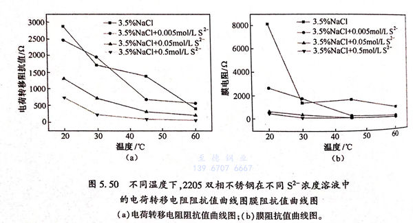 從圖5.50(a)中可以看出,在相同的溶液中,隨著溶液溫度的升高,雙相不銹鋼(gang)在溶液中的電荷轉移電阻阻抗值呈現下降的趨勢,說明隨著溶液溫度的升高,電化學反應的阻力越來越小,腐蝕越容易發生。在相同的溶液溫度下,隨著S2-的(de)(de)引入,雙相不銹鋼電化(hua)學反應的(de)(de)電荷轉(zhuan)移電阻的(de)(de)阻抗值呈現(xian)下降的(de)(de)趨勢,并且溶液中(zhong)的(de)(de)S2-濃度越高(gao),雙(shuang)相不銹鋼電化學反(fan)應的電荷轉(zhuan)移電阻的阻抗值下降越明(ming)顯(xian),說明(ming)了(le)S2-加快了腐蝕反應的速度,促進了腐蝕進一步發生。從圖5.50(b)中可以看出,在相同的溶液中,隨著溶液溫度的升高,雙相不銹鋼在溶液中形成的表面鈍化膜的膜阻抗值呈現下降的趨勢,說明隨著溶液溫度的升高,表面鈍化膜越來越不穩定。在相同的溶液溫度下,隨著S2-的引入,雙相不銹鋼在溶液中形成的表面鈍化膜的膜阻抗值呈現下降的趨勢,說明了S2-能(neng)夠破壞鈍化(hua)膜(mo)的(de)穩定性,或(huo)者(zhe)阻礙了鈍化(hua)膜(mo)的(de)形(xing)成。