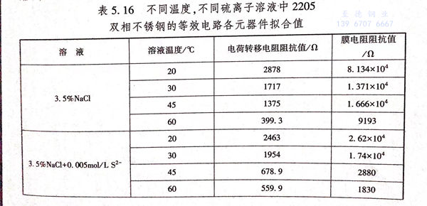 從(cong)表(biao)(biao)5.16中可以(yi)看出,在3.5%NaCl 溶液中,雙(shuang)(shuang)(shuang)相(xiang)不(bu)(bu)(bu)(bu)銹(xiu)鋼(gang)的(de)(de)(de)(de)(de)表(biao)(biao)面鈍化(hua)膜(mo)的(de)(de)(de)(de)(de)膜(mo)足(zu)抗值(zhi)(zhi)遠遠大于雙(shuang)(shuang)(shuang)相(xiang)不(bu)(bu)(bu)(bu)銹(xiu)鋼(gang)發生電(dian)化(hua)學反應(ying)的(de)(de)(de)(de)(de)電(dian)荷轉移電(dian)阻(zu)狙抗值(zhi)(zhi),說明在3.5%NaCl溶液中、雙(shuang)(shuang)(shuang)相(xiang)不(bu)(bu)(bu)(bu)銹(xiu)鋼(gang)表(biao)(biao)面的(de)(de)(de)(de)(de)鈍化(hua)膜(mo)的(de)(de)(de)(de)(de)性質決(jue)定了雙(shuang)(shuang)(shuang)相(xiang)不(bu)(bu)(bu)(bu)銹(xiu)鋼(gang)的(de)(de)(de)(de)(de)耐蝕性能(neng)。影響著(zhu)腐(fu)濁速(su)率的(de)(de)(de)(de)(de)快慢、控制(zhi)著(zhu)電(dian)化(hua)學反應(ying)。從(cong)表(biao)(biao)5.16中可以(yi)看出、當溶液溫(wen)度(du)為20℃時,雙(shuang)(shuang)(shuang)相(xiang)不(bu)(bu)(bu)(bu)銹(xiu)鋼(gang)的(de)(de)(de)(de)(de)電(dian)荷轉移電(dian)阻(zu)的(de)(de)(de)(de)(de)阻(zu)抗值(zhi)(zhi)和鈍化(hua)膜(mo)的(de)(de)(de)(de)(de)阻(zu)抗值(zhi)(zhi)分別為2878Ω 134×104Ω 向3.5%NaCl溶液(ye)中加入S2-后,雙(shuang)(shuang)相不銹鋼電化(hua)(hua)學反應(ying)的(de)(de)電荷(he)轉移電阻(zu)的(de)(de)阻(zu)抗值(zhi)(zhi)分別下(xia)降至2463Ω 、1310Ω、736.2Ω,而鈍化(hua)(hua)膜的(de)(de)固抗值(zhi)(zhi)分到下(xia)釋(shi)至2.62×104Ω,6269Ω、4528Ω;當溶液溫度為(wei)30℃時,雙(shuang)(shuang)相不銹鋼到電荷(he)轉移電阻(zu)的(de)(de)阻(zu)抗值(zhi)(zhi)和鈍化(hua)(hua)膜的(de)(de)阻(zu)抗值(zhi)(zhi)分別為(wei)1717Ω、1.37×104Ω,向(xiang)溶液中加(jia)入0.05m/L 和0.5ml/L S2-后(hou),雙(shuang)相不(bu)銹鋼的(de)(de)電(dian)荷(he)轉(zhuan)移(yi)電(dian)阻(zu)的(de)(de)阻(zu)抗(kang)值(zhi)分到下(xia)降至79.3Ω,225.5Ω,而鈍(dun)化(hua)膜的(de)(de)阻(zu)抗(kang)值(zhi)分別下(xia)降至3676Ω、1118Ω:當溶液(ye)理度為(wei)45℃時,雙(shuang)相不(bu)銹鋼的(de)(de)電(dian)荷(he)轉(zhuan)移(yi)電(dian)阻(zu)的(de)(de)阻(zu)抗(kang)值(zhi)和鈍(dun)化(hua)膜的(de)(de)阻(zu)抗(kang)值(zhi)分到為(wei) 1375Ω、1.656×104Ω,向3.5%NaCl溶液中加入S2-后(hou),雙相不銹鋼(gang)電(dian)化學支應的電(dian)荷轉移電(dian)阻的阻抗(kang)值分別(bie)下降(jiang)至(zhi)678.9Ω,312.6Ω、89.51Ω、而鈍(dun)化膜的阻抗(kang)值分別(bie)下降(jiang)至(zhi)2880Ω,1103Ω、1206Ω;當溶液(ye)溫(wen)度為30℃時,雙相不銹鋼(gang)約電(dian)荷轉移電(dian)阻的阻抗(kang)值和(he)鈍(dun)化膜的阻抗(kang)值分別(bie)為199.8Ω、9193Ω,向(xiang)溶液(ye)中加入0.05mm/L和(he)0.5mml/L.S2-后,雙相不銹(xiu)鋼的電荷轉移電限的阻抗(kang)值分(fen)(fen)別下降(jiang)(jiang)至719.3Ω,225.5Ω,而鈍化膜的阻抗(kang)值分(fen)(fen)別下降(jiang)(jiang)至793.1Ω,546.4Ω.從(cong)以(yi)上(shang)分(fen)(fen)析可以(yi)看出,當S2-加入至3.5%NaCl溶液中后,雙相不銹(xiu)鋼的純(chun)化膜阻(zu)抗值稱電(dian)莉轉移(yi)電(dian)阻(zu)阻(zu)抗值都(dou)相應減小:但(dan)是,S2-使得鈍化膜陽抗值減小的趨(qu)勢更(geng)加明顯,說明S2-主要通過(guo)破壞鈍化膜的方(fang)式加速(su)了(le)(le)雙相(xiang)(xiang)不銹鋼的腐(fu)蝕速(su)率(lv),降低(di)了(le)(le)雙相(xiang)(xiang)不銹鋼的耐蝕性能(neng)。