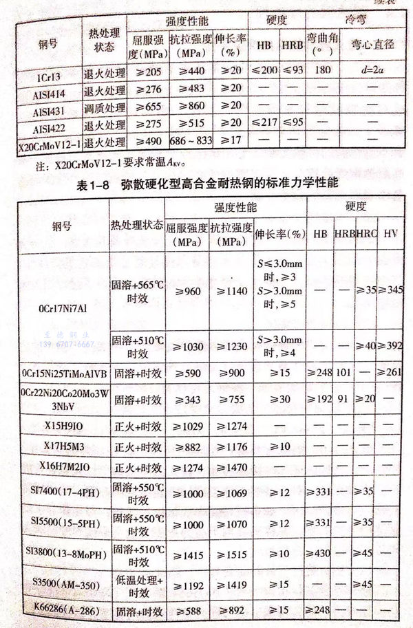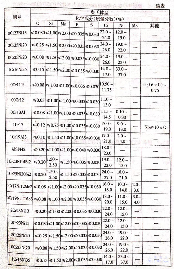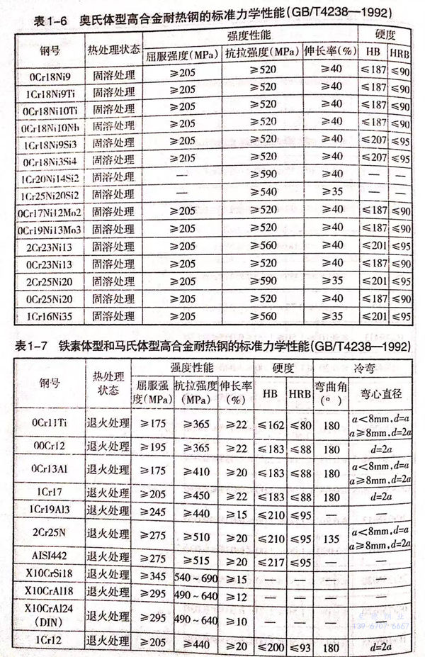 我(wo)國(guo)和(he)世界主要(yao)工業國(guo)家常用(yong)的(de)奧(ao)氏體(ti)(ti)型、鐵素體(ti)(ti)型和(he)馬氏體(ti)(ti)型高合(he)金耐熱鋼的(de)標準化學成分列于表(biao)1-5。這些鋼在供貨狀態下的(de)力(li)學性能分別列于表(biao)1-6、表(biao)1-7和(he)表(biao)1-8。