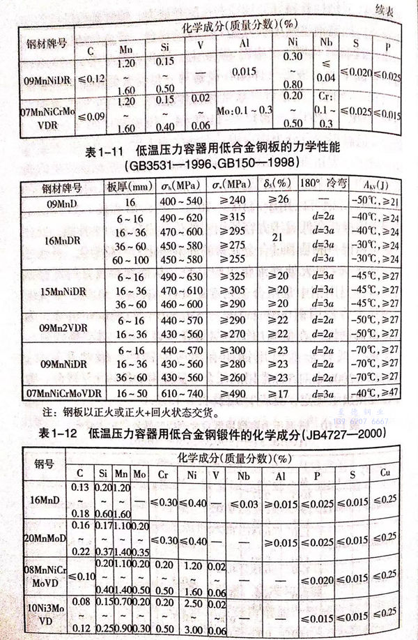低(di)(di)(di)合(he)金低(di)(di)(di)溫(wen)(wen)(wen)用(yong)鋼一般是(shi)(shi)通過合(he)金元(yuan)素的(de)固溶強化(hua)、晶粒(li)細(xi)化(hua),并(bing)(bing)通過正火(huo)或(huo)正火(huo)+回火(huo)處理細(xi)化(hua)組織晶粒(li),從而獲得(de)良(liang)好的(de)低(di)(di)(di)溫(wen)(wen)(wen)韌性(xing)。在低(di)(di)(di)溫(wen)(wen)(wen)用(yong)鋼中(zhong)(zhong)常用(yong)合(he)金元(yuan)素是(shi)(shi)Mn、Ni、V、Nb等(deng),如我(wo)國(guo)低(di)(di)(di)溫(wen)(wen)(wen)壓力(li)容器用(yong)鋼09Mn2VDR、15MnNiDR及(ji)09MnNiDR等(deng),為保證低(di)(di)(di)溫(wen)(wen)(wen)韌性(xing),在低(di)(di)(di)溫(wen)(wen)(wen)用(yong)鋼中(zhong)(zhong)盡量降低(di)(di)(di)碳(tan)含量,并(bing)(bing)嚴格控(kong)制硫、磷(lin)含量。低(di)(di)(di)合(he)金低(di)(di)(di)溫(wen)(wen)(wen)用(yong)鋼還有相應(ying)的(de)鑄件(jian)、鍛件(jian)及(ji)管(guan)材(cai),JB4727-2000中(zhong)(zhong)對5種常用(yong)的(de)低(di)(di)(di)合(he)金低(di)(di)(di)溫(wen)(wen)(wen)鋼鍛件(jian)的(de)化(hua)學成(cheng)分、力(li)學性(xing)能做出(chu)了規定,見表(biao)1-12及(ji)表(biao)1-13所示。