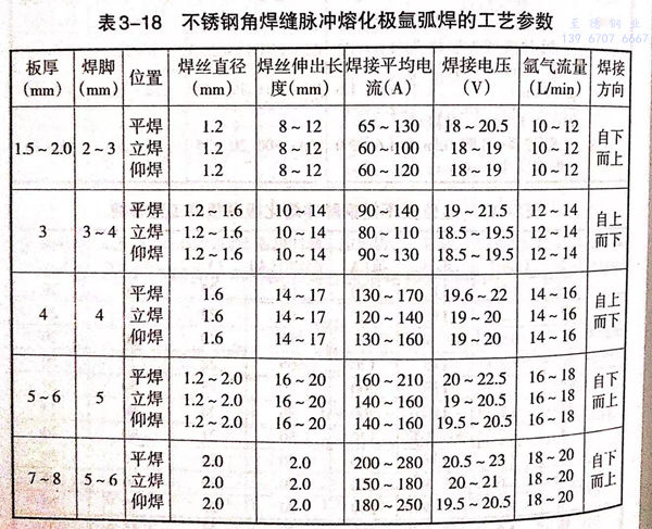 表3-16 平焊(han)位置(zhi)不銹(xiu)鋼(18-8)脈沖熔化極(ji)氬弧焊(han)的工藝參數)