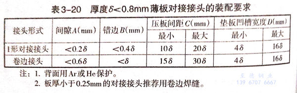 工件厚度(du)小于(yu)1.6mm,采用微束等離(li)子弧(hu)焊時,接(jie)頭(tou)形式有(you):對接(jie)、卷邊對接(jie)、卷邊角接(jie)、端面接(jie)頭(tou)。當厚度(du)小于(yu)0.8mm時,接(jie)頭(tou)裝配要求列于(yu)表3-21。