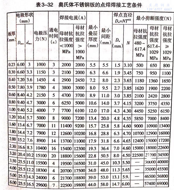 奧氏體不銹鋼的(de)點焊焊接條件如表3-32所(suo)示。