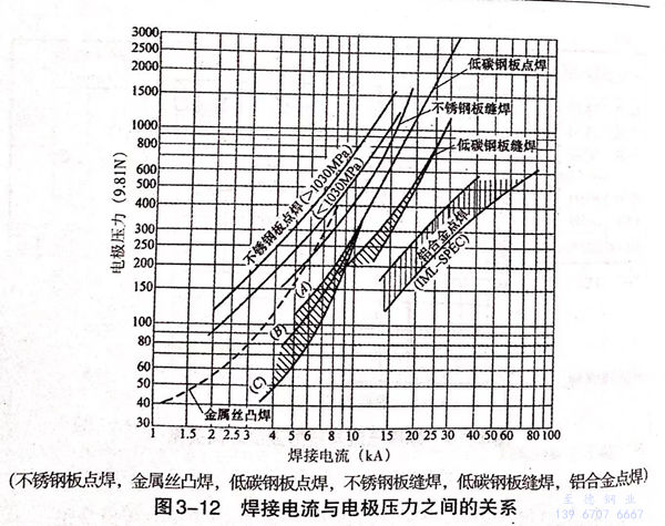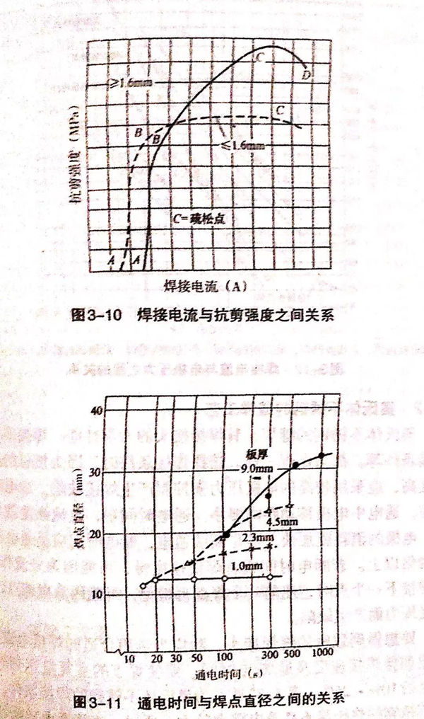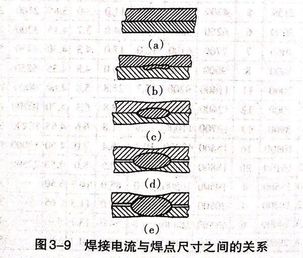 在點焊(han)的(de)焊(han)接(jie)(jie)條件中(zhong)焊(han)接(jie)(jie)電(dian)流(liu)(liu)、通(tong)電(dian)時(shi)間和電(dian)極(ji)壓力這(zhe)三大條件最重要,對接(jie)(jie)頭強(qiang)度有影響。圖3-9所示(shi)為(wei)焊(han)接(jie)(jie)電(dian)流(liu)(liu)與(yu)(yu)焊(han)點尺寸(cun)之(zhi)間的(de)關系(xi)。圖3-10所示(shi)為(wei)焊(han)接(jie)(jie)電(dian)流(liu)(liu)與(yu)(yu)抗剪強(qiang)度之(zhi)間的(de)關系(xi),圖3-11所示(shi)為(wei)通(tong)電(dian)時(shi)間與(yu)(yu)焊(han)點直徑之(zhi)間的(de)關系(xi),圖3-12所示(shi)為(wei)焊(han)接(jie)(jie)電(dian)流(liu)(liu)與(yu)(yu)電(dian)極(ji)壓力之(zhi)間的(de)關系(xi)。