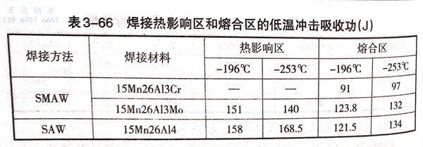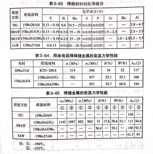 15Mn26Al14鋼可用(yong)SWAM、SAW及TIG方法焊接,其(qi)所(suo)用(yong)焊接材料及力學性能(neng)在表3-63~表3-66中給出。