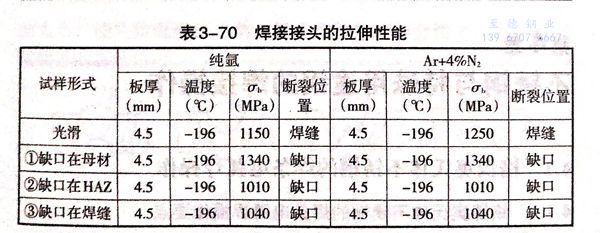 采(cai)用TIG焊(han)(han)(han)(han)法,保(bao)(bao)護(hu)氣(qi)體(ti)(ti)用純氬氣(qi)或氬氣(qi)+氮氣(qi),填(tian)充焊(han)(han)(han)(han)絲直徑(jing)4mm.母(mu)材及焊(han)(han)(han)(han)縫(feng)金屬(shu)的(de)(de)化學成分在(zai)表(biao)(biao)(biao)3-67中給出。表(biao)(biao)(biao)3-68為(wei)-196℃時(shi)母(mu)材的(de)(de)力(li)學性(xing)能。表(biao)(biao)(biao)3-69為(wei)TIG焊(han)(han)(han)(han)的(de)(de)焊(han)(han)(han)(han)接(jie)(jie)參數。表(biao)(biao)(biao)3-70為(wei)兩種保(bao)(bao)護(hu)氣(qi)體(ti)(ti)下焊(han)(han)(han)(han)接(jie)(jie)接(jie)(jie)頭(tou)的(de)(de)拉伸性(xing)能。焊(han)(han)(han)(han)接(jie)(jie)接(jie)(jie)頭(tou)的(de)(de)硬(ying)(ying)(ying)度(du)測定(ding)表(biao)(biao)(biao)明(ming),焊(han)(han)(han)(han)縫(feng)金屬(shu)的(de)(de)硬(ying)(ying)(ying)度(du)因保(bao)(bao)護(hu)氣(qi)體(ti)(ti)不同而(er)不同。保(bao)(bao)護(hu)氣(qi)體(ti)(ti)為(wei)Ar+8%N2時(shi),焊(han)(han)(han)(han)縫(feng)金屬(shu)的(de)(de)硬(ying)(ying)(ying)度(du)比Ar+4%N2作為(wei)保(bao)(bao)護(hu)氣(qi)體(ti)(ti)時(shi)高;而(er)Ar+4%N2作為(wei)保(bao)(bao)護(hu)氣(qi)體(ti)(ti)時(shi),焊(han)(han)(han)(han)縫(feng)金屬(shu)的(de)(de)硬(ying)(ying)(ying)度(du)又高于純氬作為(wei)保(bao)(bao)護(hu)氣(qi)體(ti)(ti)焊(han)(han)(han)(han)接(jie)(jie)時(shi)的(de)(de)焊(han)(han)(han)(han)縫(feng)金屬(shu)硬(ying)(ying)(ying)度(du)。焊(han)(han)(han)(han)縫(feng)金屬(shu)的(de)(de)組(zu)織都是純奧氏體(ti)(ti),這(zhe)一結(jie)果(guo)充分說明(ming)N的(de)(de)強化作用。