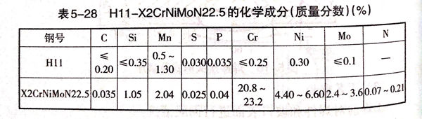 采用上述焊接材(cai)料和工藝得到的(de)H11-X2CrNiMoN22.5雙相(xiang)不銹鋼復合鋼板的(de)焊縫金屬化學成分見表(biao)5-32.
