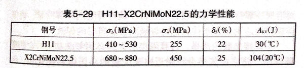 在我國生產的4DM-PKM加壓汽化爐,爐體長期處于高溫高壓之下且在腐蝕介質中工作,選用了德國H11-X2CrNiMoN22.5雙相不銹鋼復合板制造。覆層材料為雙(shuang)相不銹鋼X2CrNiMoN22.5(相當于SAF2205),作為耐高溫耐腐蝕材料;基層選用碳鋼H11,用來滿足結構強度和剛度。其化學成分和力學性能分別見表5-28和表5-29.