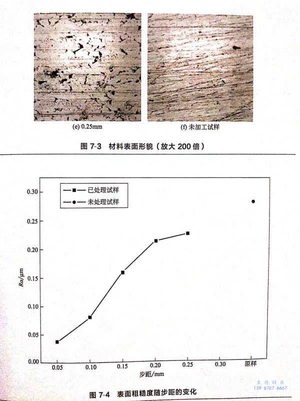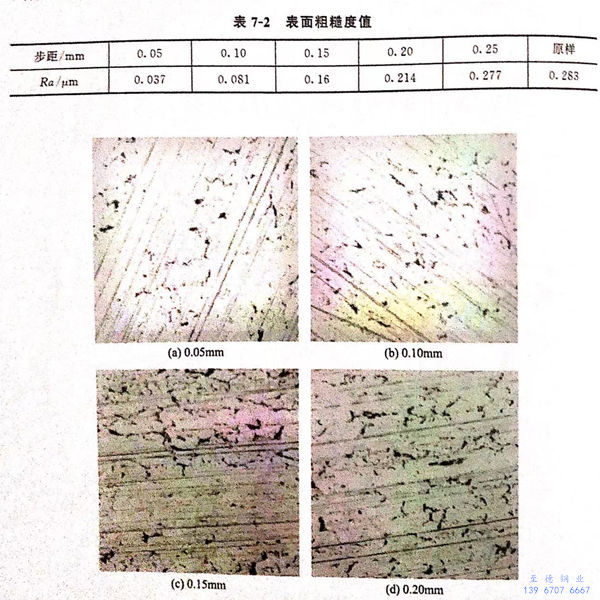 圖(tu)(tu)7-4為(wei)不同步距下超聲滾壓試樣表(biao)(biao)(biao)(biao)面(mian)(mian)粗糙度(du)(du)的變(bian)化(hua)。從圖(tu)(tu)中(zhong)可以看出(chu),加工步距對(dui)表(biao)(biao)(biao)(biao)面(mian)(mian)粗糙度(du)(du)有(you)重要的影響(xiang),表(biao)(biao)(biao)(biao)面(mian)(mian)粗糙度(du)(du)隨著加工步距的減(jian)小而(er)減(jian)小,表(biao)(biao)(biao)(biao)面(mian)(mian)粗糙度(du)(du)可降低(di)到0.037μm.未處理表(biao)(biao)(biao)(biao)面(mian)(mian)粗糙度(du)(du)Ra為(wei)0.283μm,與(yu)未處理表(biao)(biao)(biao)(biao)面(mian)(mian)相比較,處理表(biao)(biao)(biao)(biao)面(mian)(mian)因被碾壓而(er)形成光(guang)滑(hua)的金屬(shu)層(ceng),從而(er)降低(di)了表(biao)(biao)(biao)(biao)面(mian)(mian)粗糙度(du)(du)。