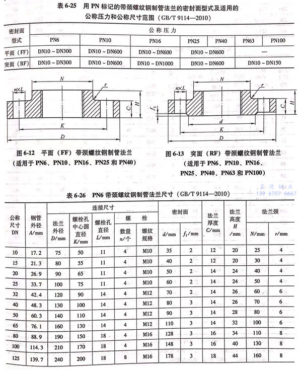 1. 用PN標記的帶頸螺紋鋼制管法蘭:用PN標記的帶頸螺紋鋼制管法蘭密封面(mian)型式及適用的公稱壓力和公稱尺寸范圍見表6-25; 用PN標記的帶頸螺紋鋼制管法蘭的型式見圖6-12~圖6-13,尺寸見表6-26~表6-32。