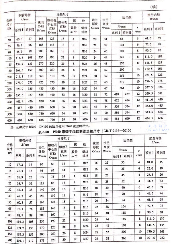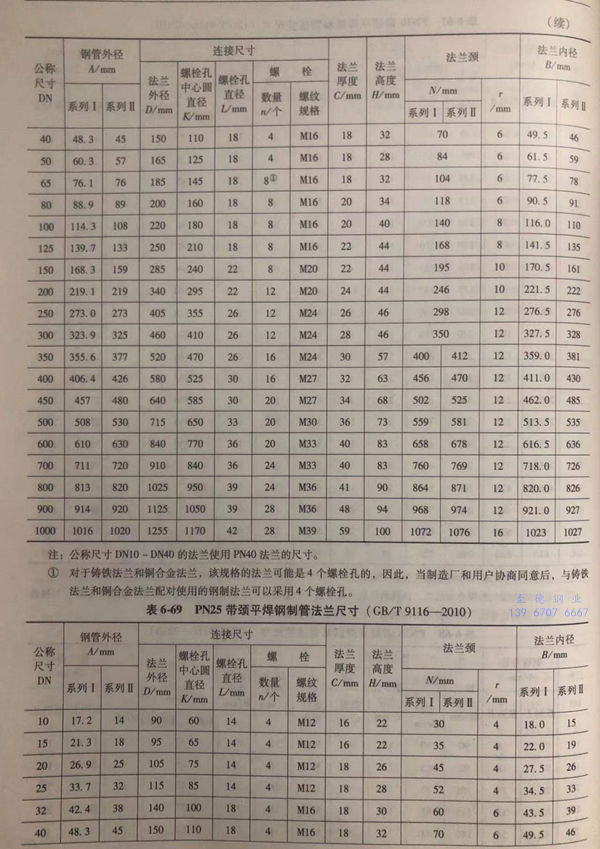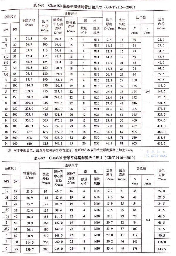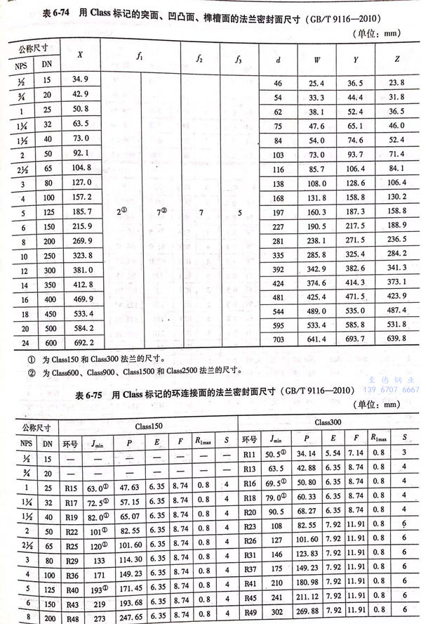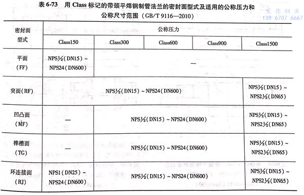 用(yong)Class標記的(de)帶頸(jing)平焊鋼制(zhi)管法蘭的(de)密封面(mian)型(xing)式及適(shi)用(yong)的(de)公(gong)稱壓力和(he)公(gong)稱尺寸(cun)范(fan)圍見表6-73;用(yong)Class標記的(de)帶頸(jing)平焊鋼制(zhi)管法蘭型(xing)式見圖6-31~圖6-35,法蘭密封面(mian)尺寸(cun)見表6-74、表6-75,法蘭結構尺寸(cun)或尺寸(cun)見表6-76~表6-80。